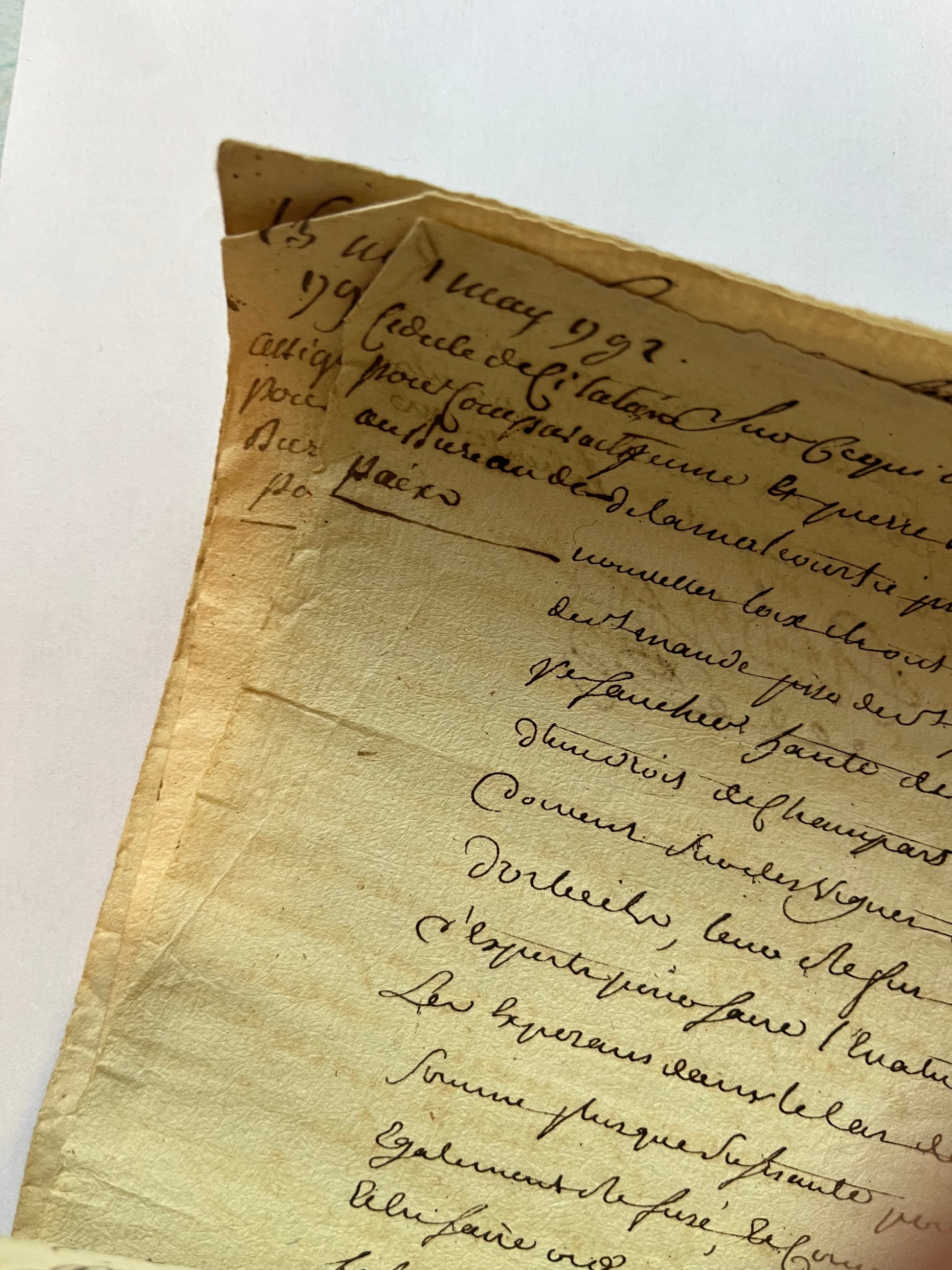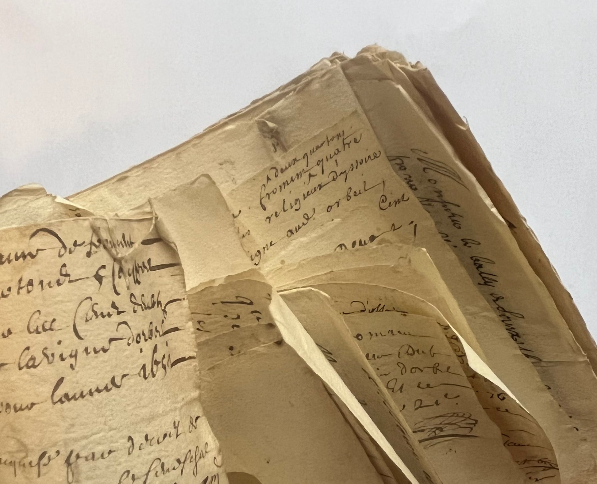 This psalter leaf was later reused as a holder for 18th century manuscripts at a French nunnery. The documents are interesting as they record the dissolution of the monastery in 1792, after the French revolution, and the attempts to provide for the nuns.