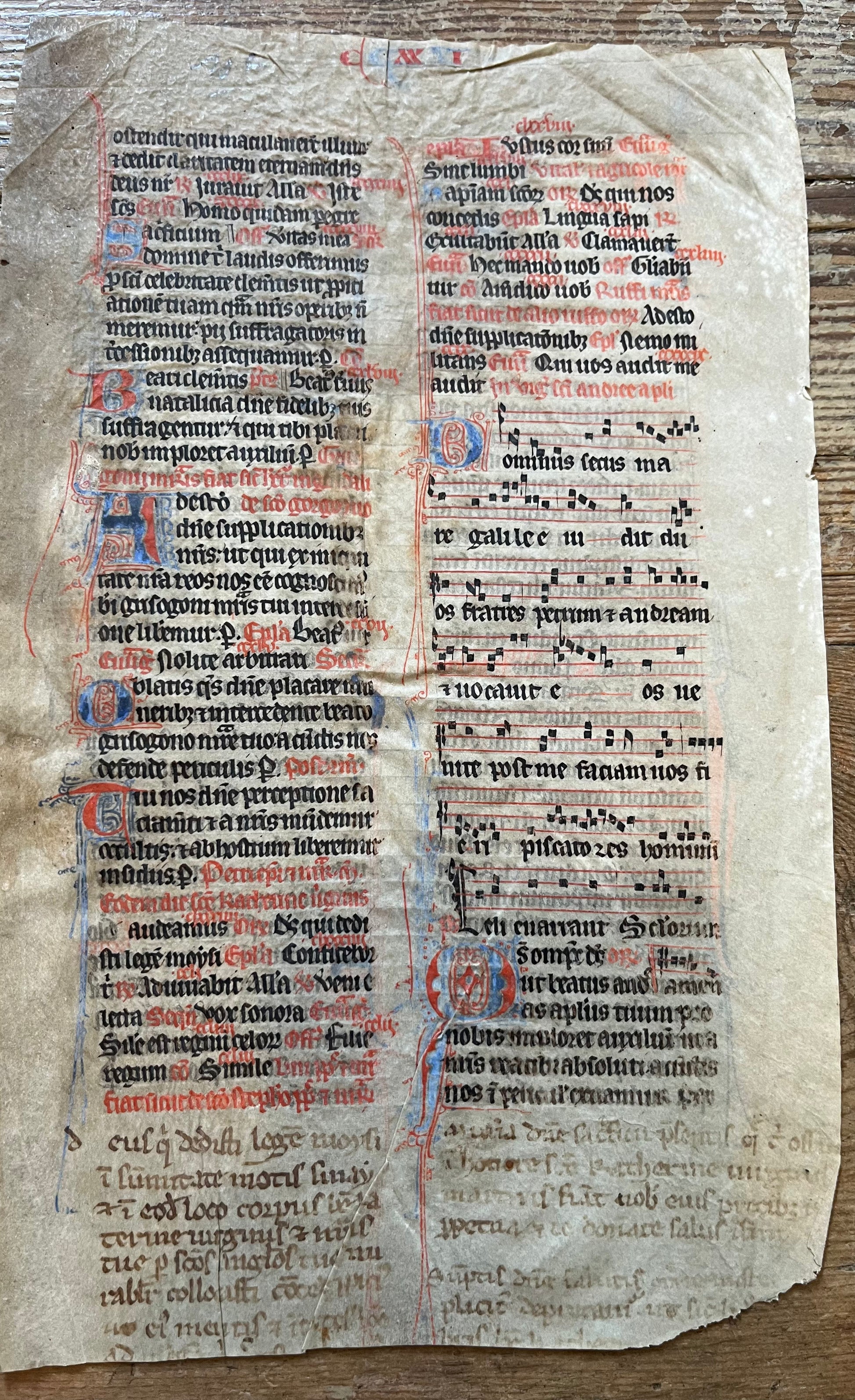 c1300 Century Leaf from a Breviary - with Gregorian Chant and decorative Lombard initials.