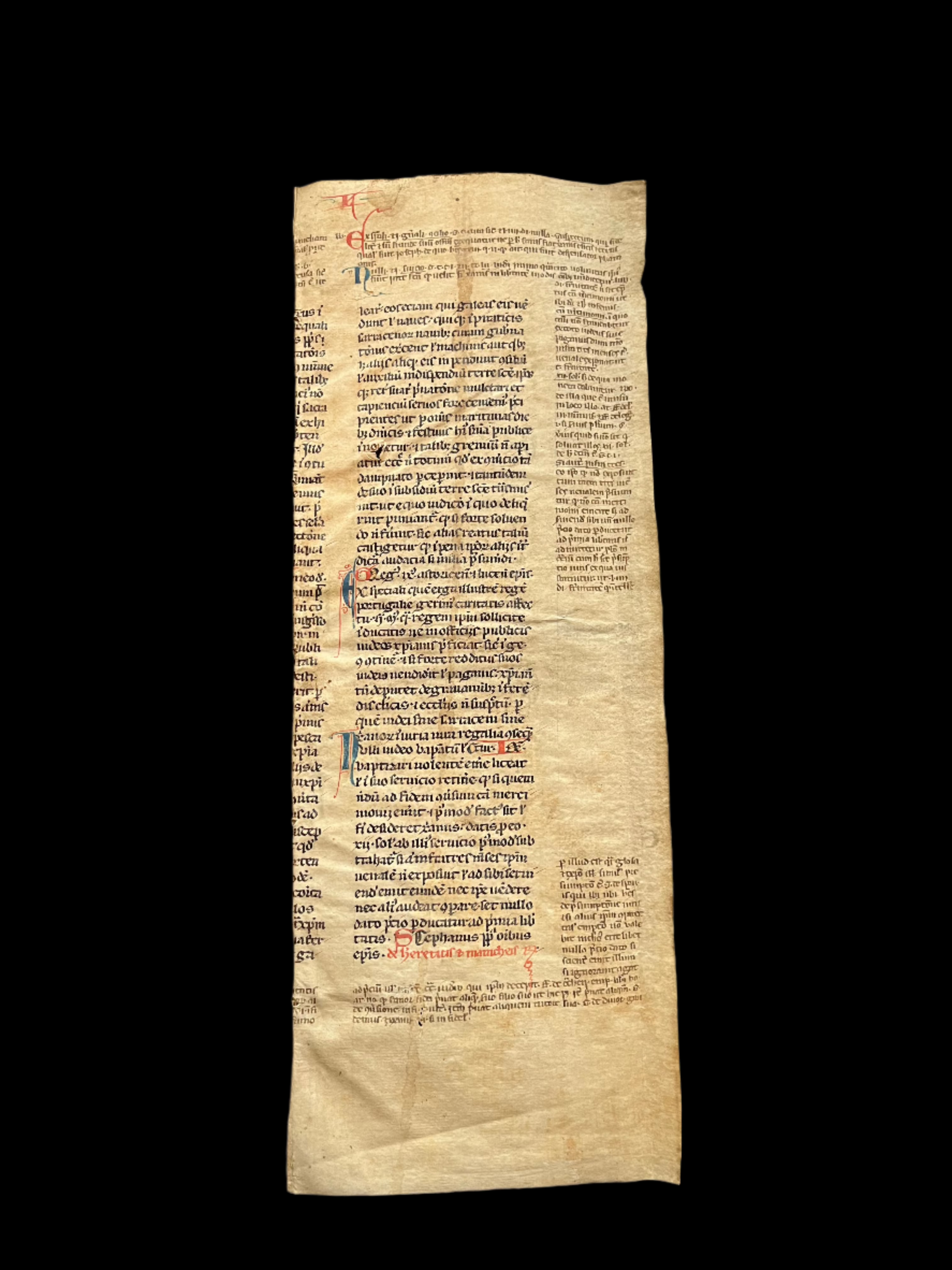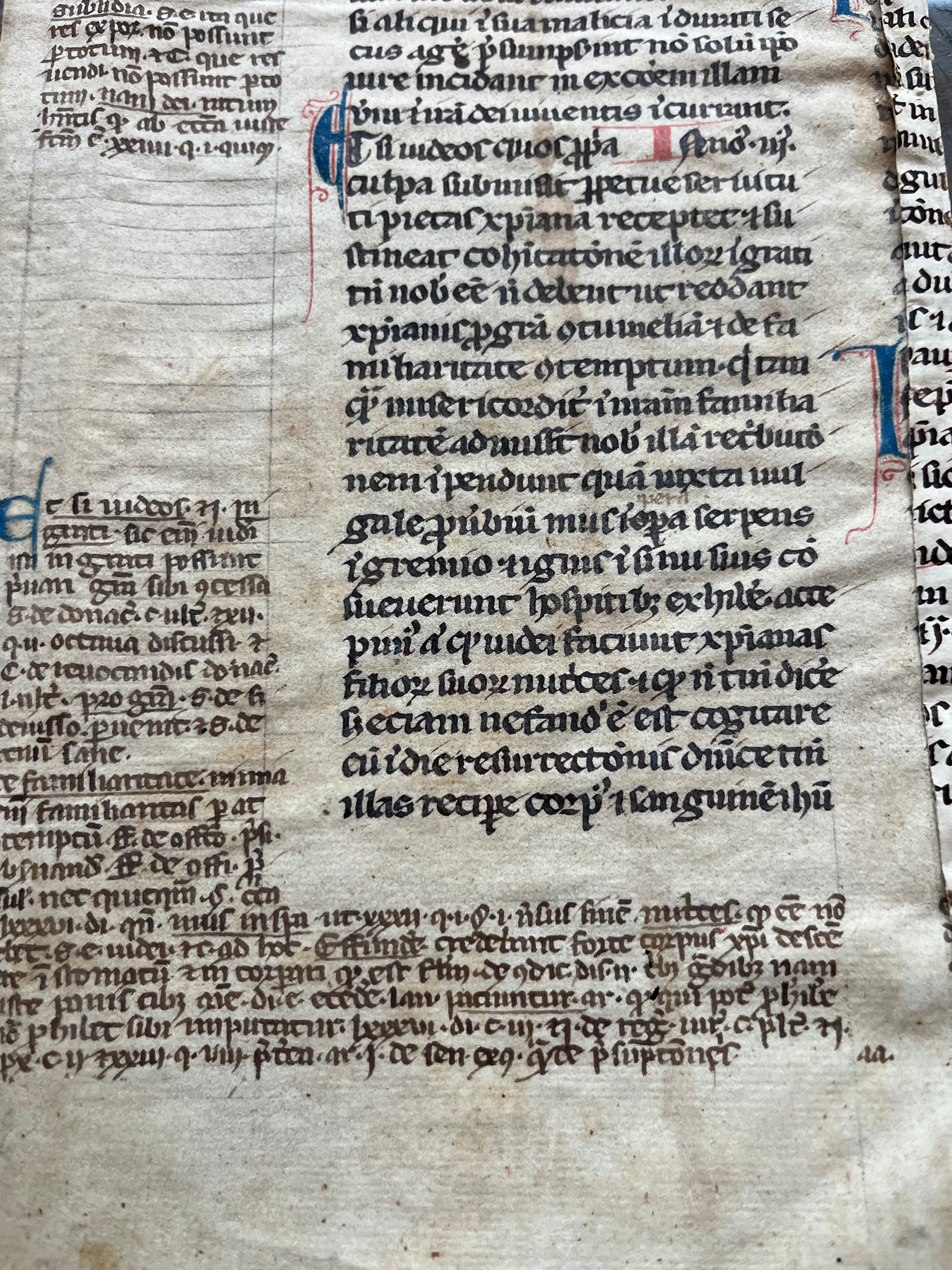 The fragment is on sturdy vellum and was likely used in binding, hence its survival to this day. The text is in a gothic hand with red and blue capital letters, and is surrounded by a commentary.