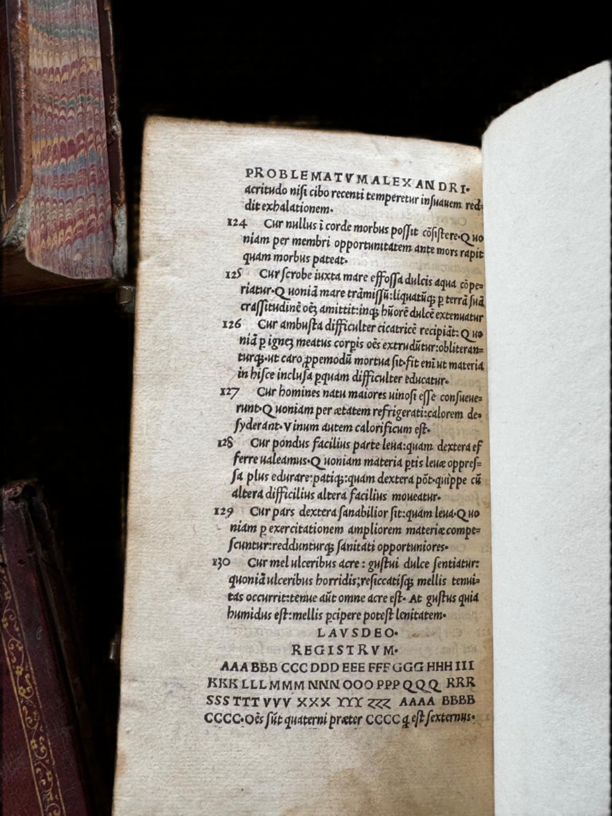 The binding contains a 1505 translation of Aristotle's Problemata by Theodorus Gaza (1410-1475) which had a deep effect on Renaissance thought. The text discusses human and animal behaviours such as “Why do we cry when we laugh”, “Why does music affect emotions so much” and the profound “why do bald men have better eyesight?!”. Contemporary 15th and 16th century readers tried to interpret these ancient questions in the context of human sin at a deeply spiritual time.