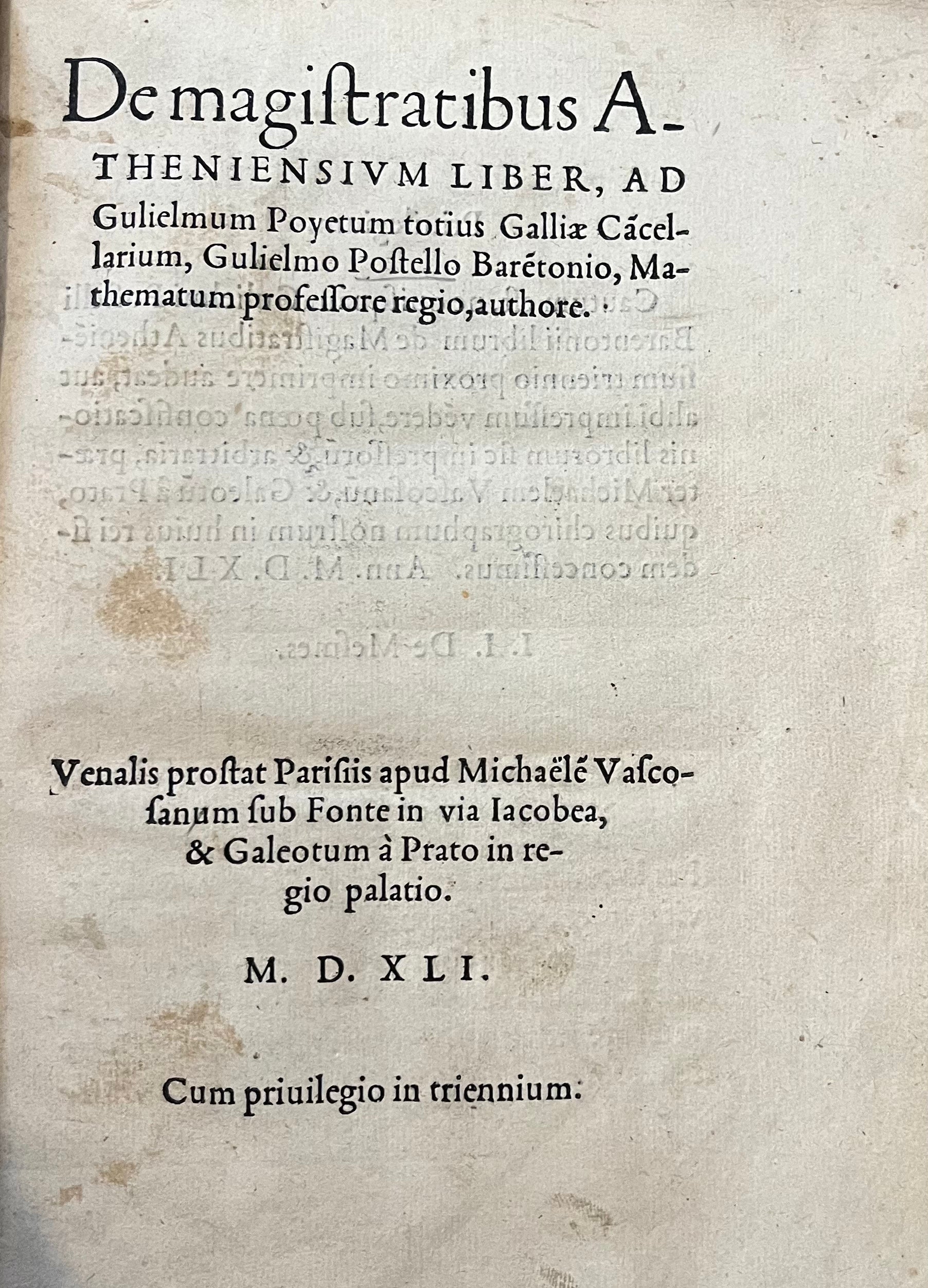 This work “De Magistratibus Atheniensium” describes the political structure of Athens and the role of Magistrates in Governance and law. Postel was particularly interested in how Greek philosophy could influence contemporary politics including Government and Law in Europe.
