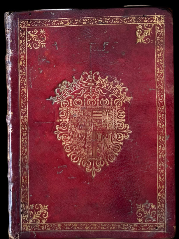 This copy is housed in a lovely Italianate style early 17th century red morocco binding with a central coat of arms which likely represents a member of the Habsburg house. The Kingdoms of Castille (Castle), Leon (Lion), Aragon (vertical lines and Eagle ), Gibraltar (Pillar of Hercules) are represented in the coat of arms. The arms can be identified as those of Don Ramiro Nuñez de Guzmán (1600-1668), Duke of Medina de las Torres, Viceroy of Naples.