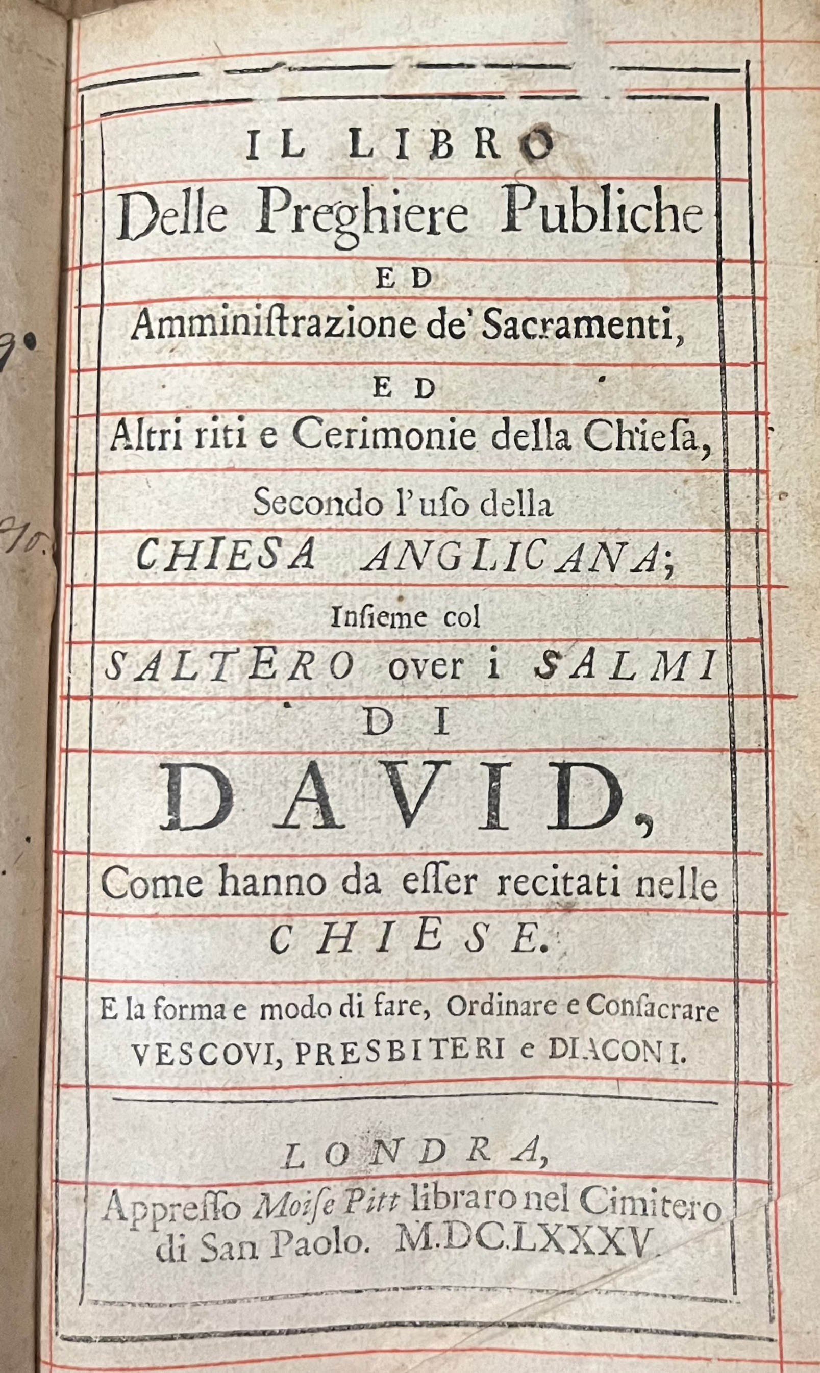 1st Italian Edition of the Book of Common Prayer - “Il Libro Delle Publiche ed Amministratzione de’Sacramenti” - 1685