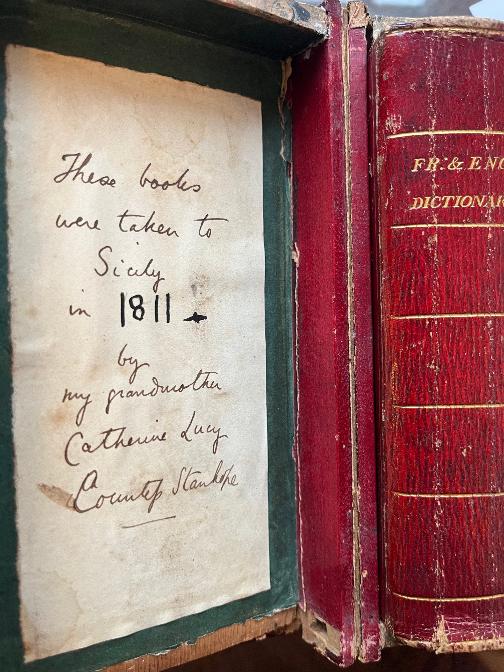 Inscription to inside of travel case: " These books were taken to Sicily in 1811 by my grandmother Catherine Lucy Countess Stanhope’"