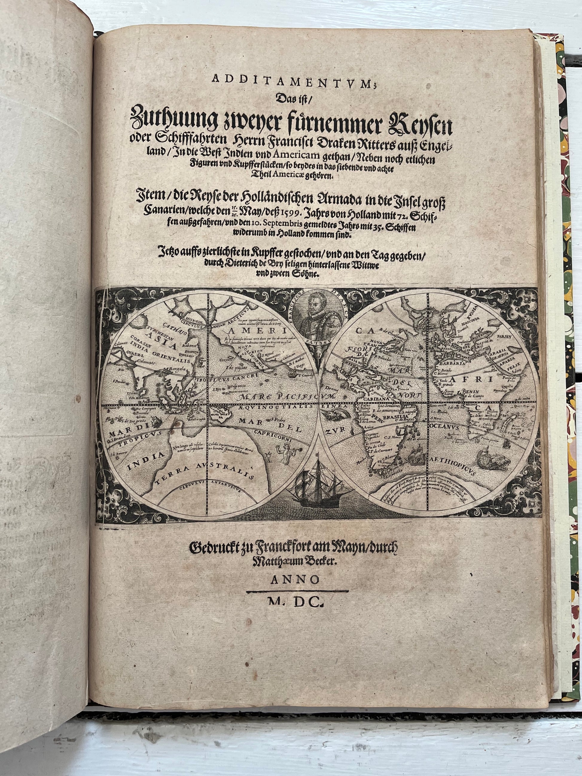 A set of important narratives including Drake's Circumnavigation and his naming of California as "New Albion". The German edition is less common than the latin edition.