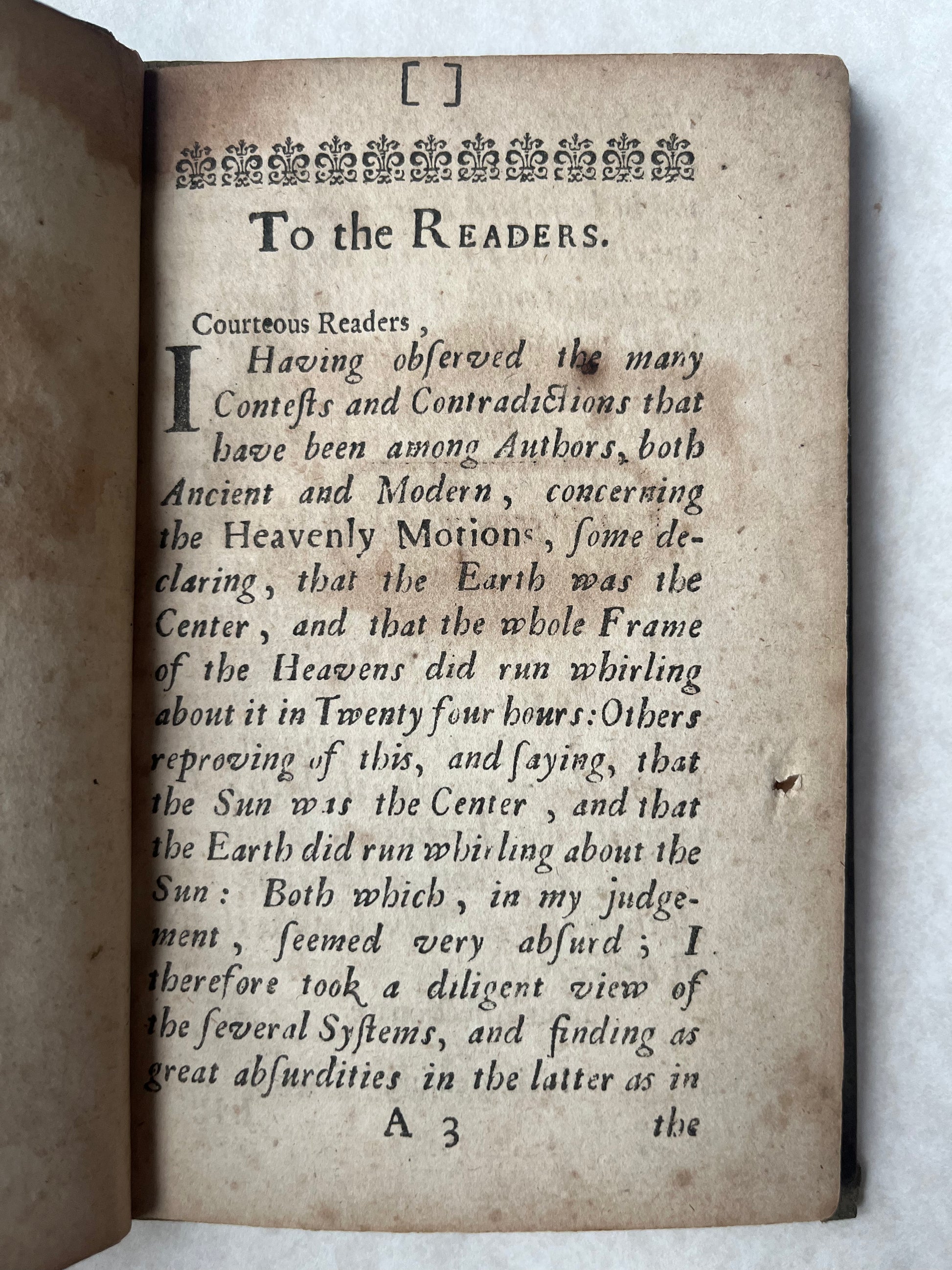 "Courteous Readers...Having observed the many Contests and Contradictions that have been among Authors, both Ancient and Modern, concerning the Heavenly Motions, some declaring, that the Earth was the Centre, and that the whole Frame of the Heavens did run whirling about it in Twenty four hours: Others reproving of this, and saying, that the Sun was the Centre, and that the Earth did run whirling about the Sun: Both which, in my judgement, seemed very absurd"