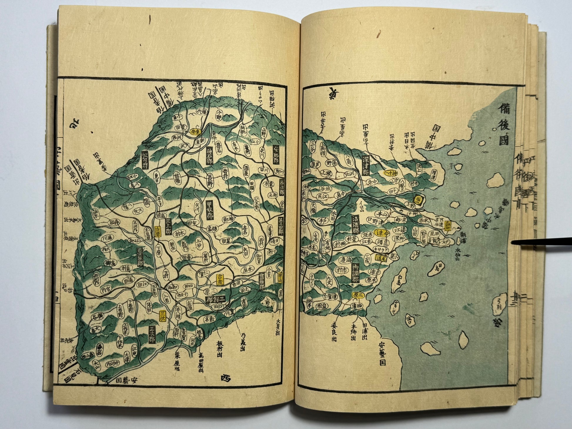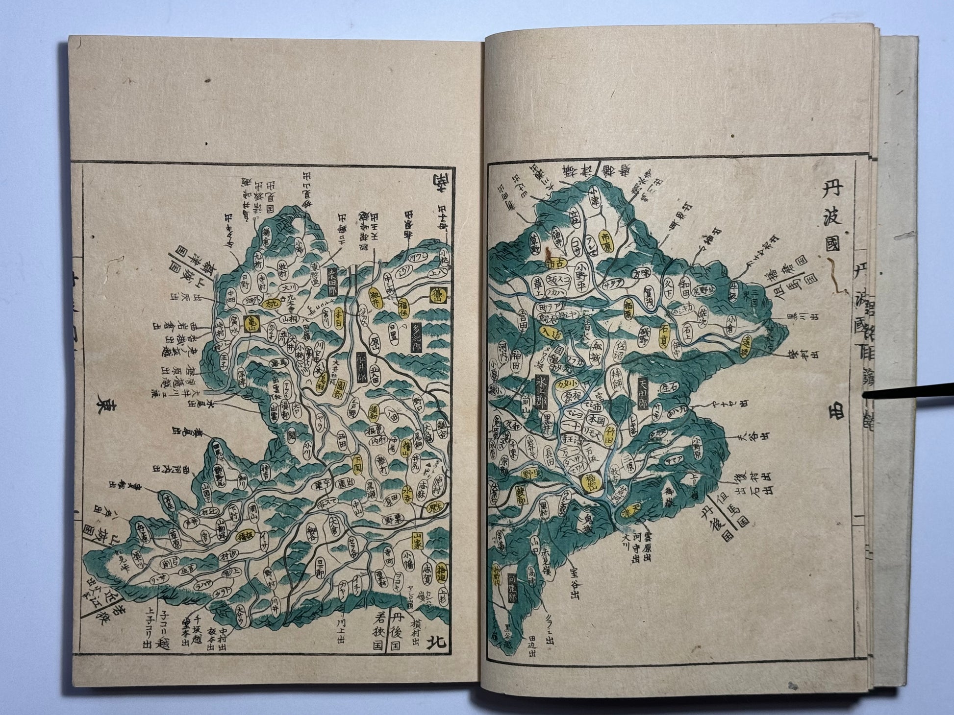 Early edition of this beautiful Atlas of Japan and its regions. Attractive printing using separate coloured woodblocks to print in yellow, green and blue. There is one map per province, but with a small number divided into several maps.