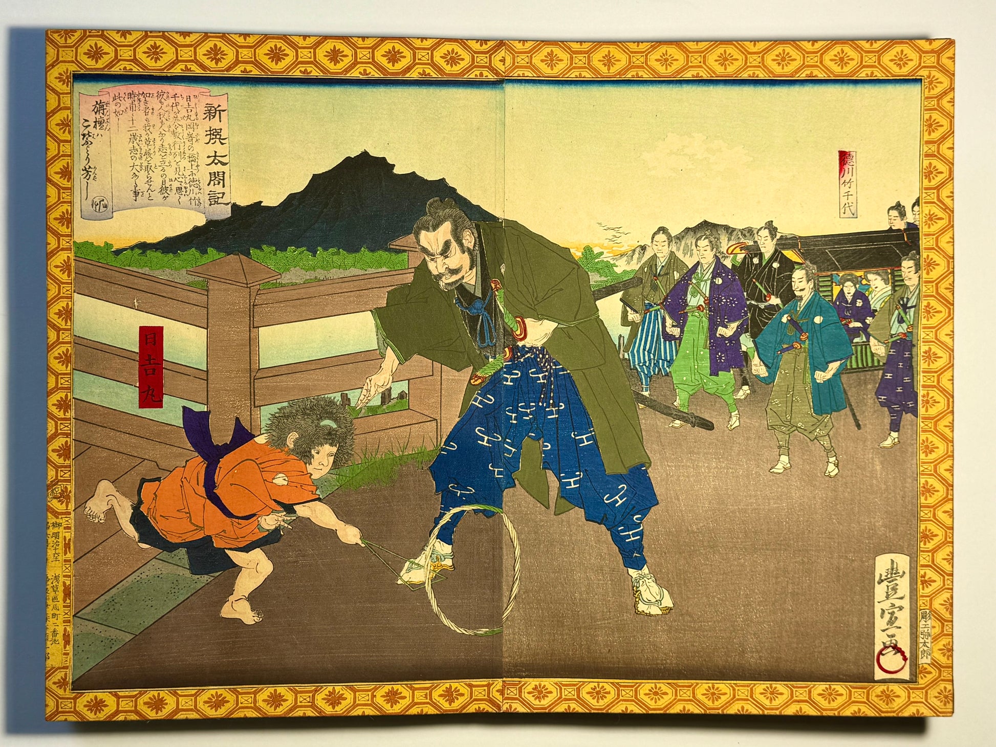 Little is known about Toyonobu, who spent much of his life producing illustrations for Ehon and musha-e images. He is most famous for this series “Shinsen Taikoki” which illustrates the life of Toyotomi Hideyoshi, a famous Shogun who unified Japan during the Sengoku civil wars of the late 1500s. The mokuroku (table of contents) describes 50 episodes from his life, of which 27 are included in this beautiful album. Designs depict Hideoyshi’s childhood and battle scenes including the Battle of Anegawa and the Battle of Nagashino.