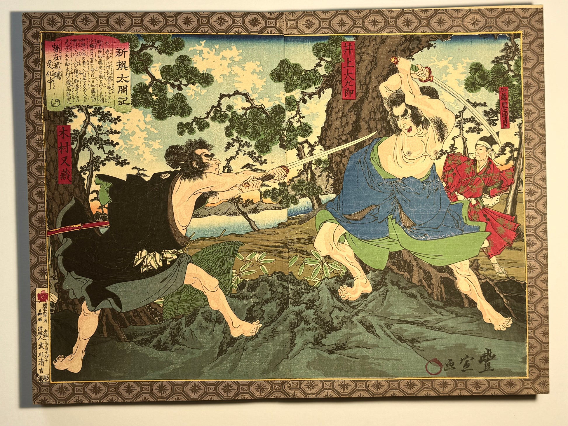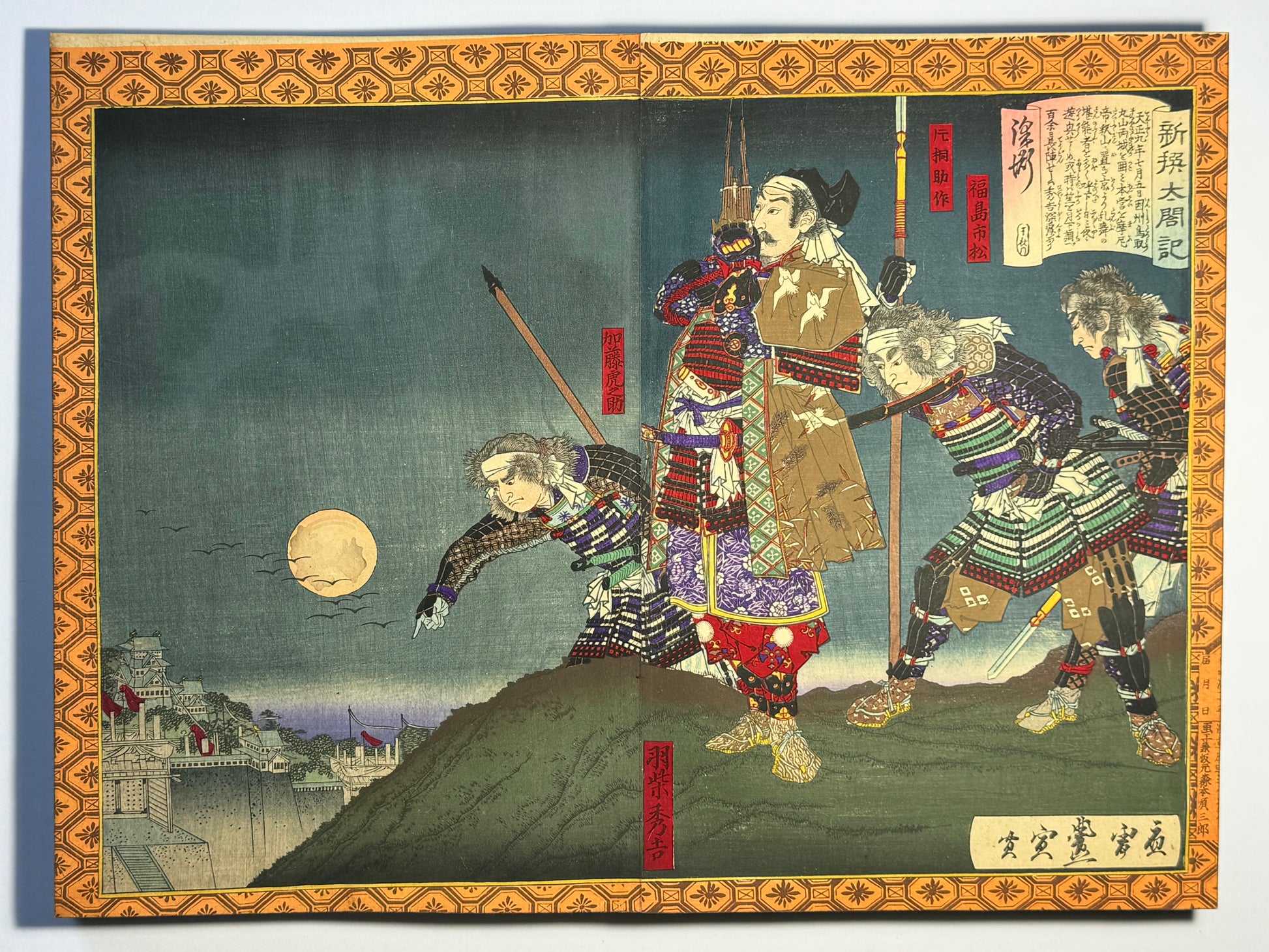 Beautiful silk bound album of Ukiyo-e Diptychs by Toyonobu - 1883 - "Newly Selected Records of the Taiko"