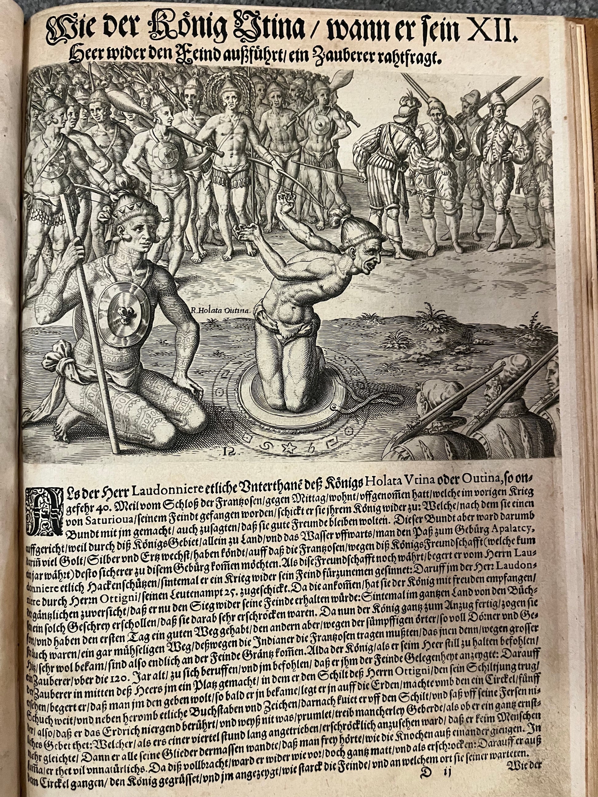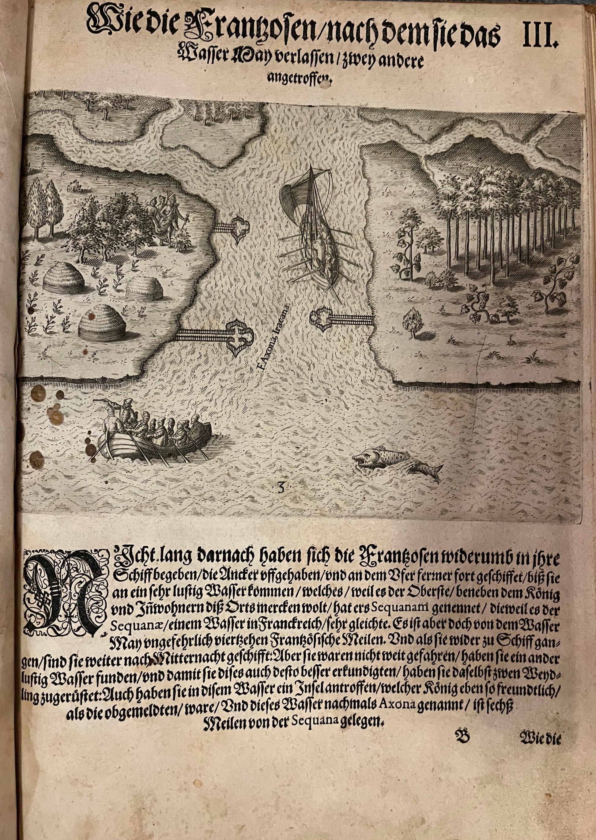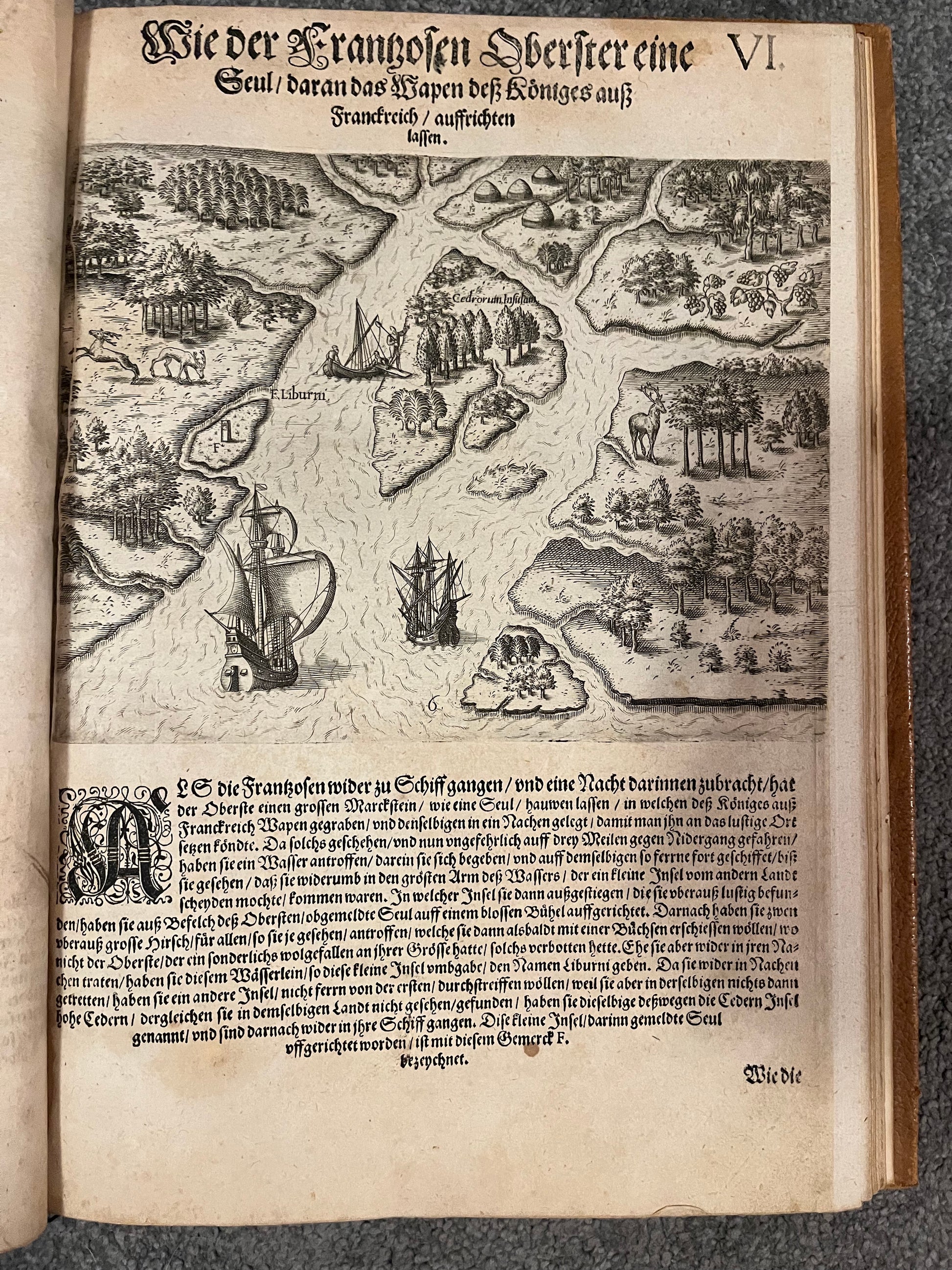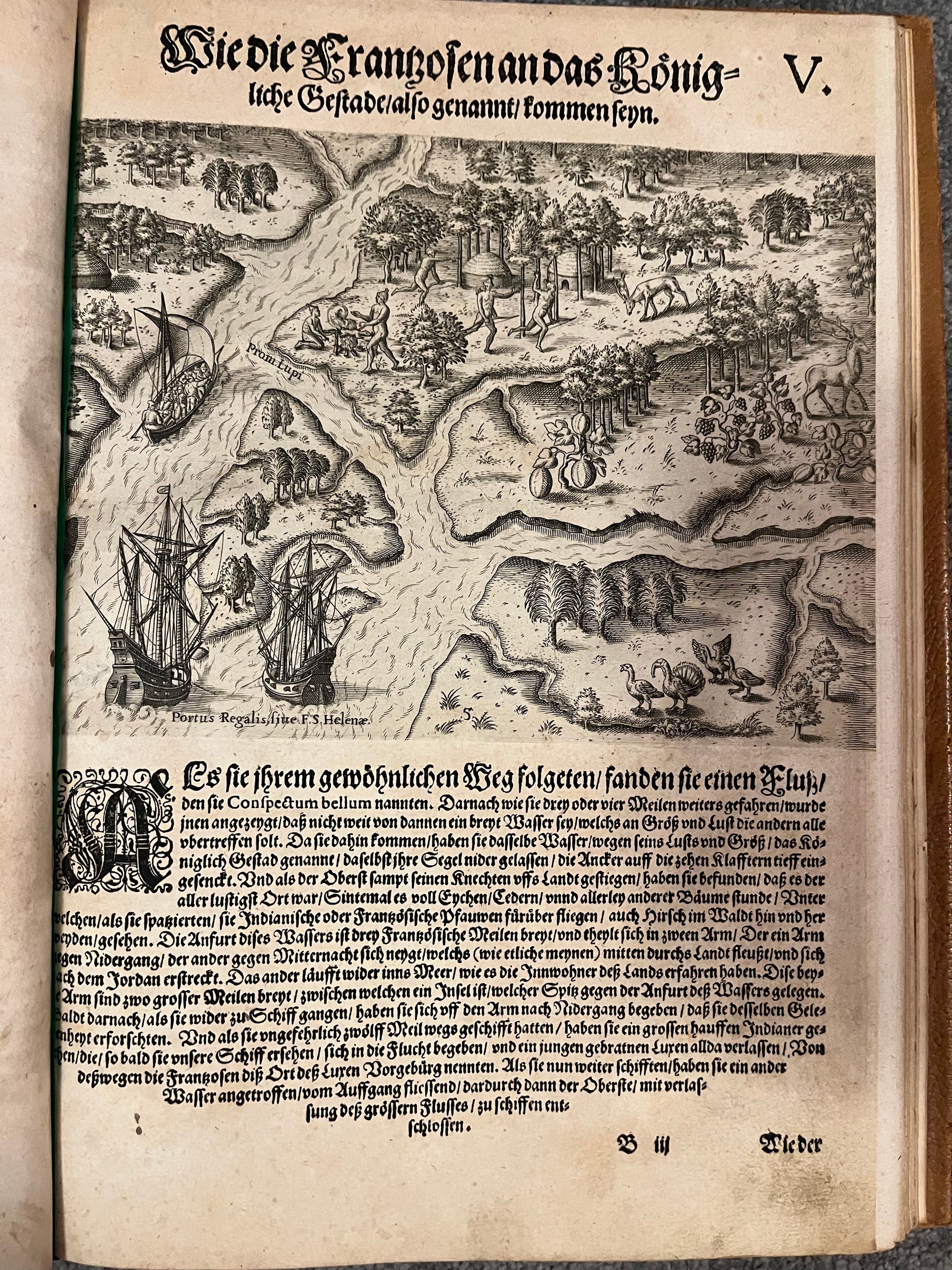 “DER ANDER THEYL/ der Newlich erfundenen Landt- schafft Americae, Von dreyen Schiffahrten/ so die Frantzosen in Floridam (die gegen Nidergang gelegen) gethan. Eine vnter dem Hauptmann H. Laudonniere, Anno 1564. Die ander vnter H. Ribald 1565. Die dritte/ vnter H. Guorguesio 1567. ges- chehen. Francofortiad Moenvm Typis Ioanis Wecheli, Stantibus vero Theodori de Bry Anno MDXCI. Venales reperiutur in officina Sigismundi Feirabedii”
