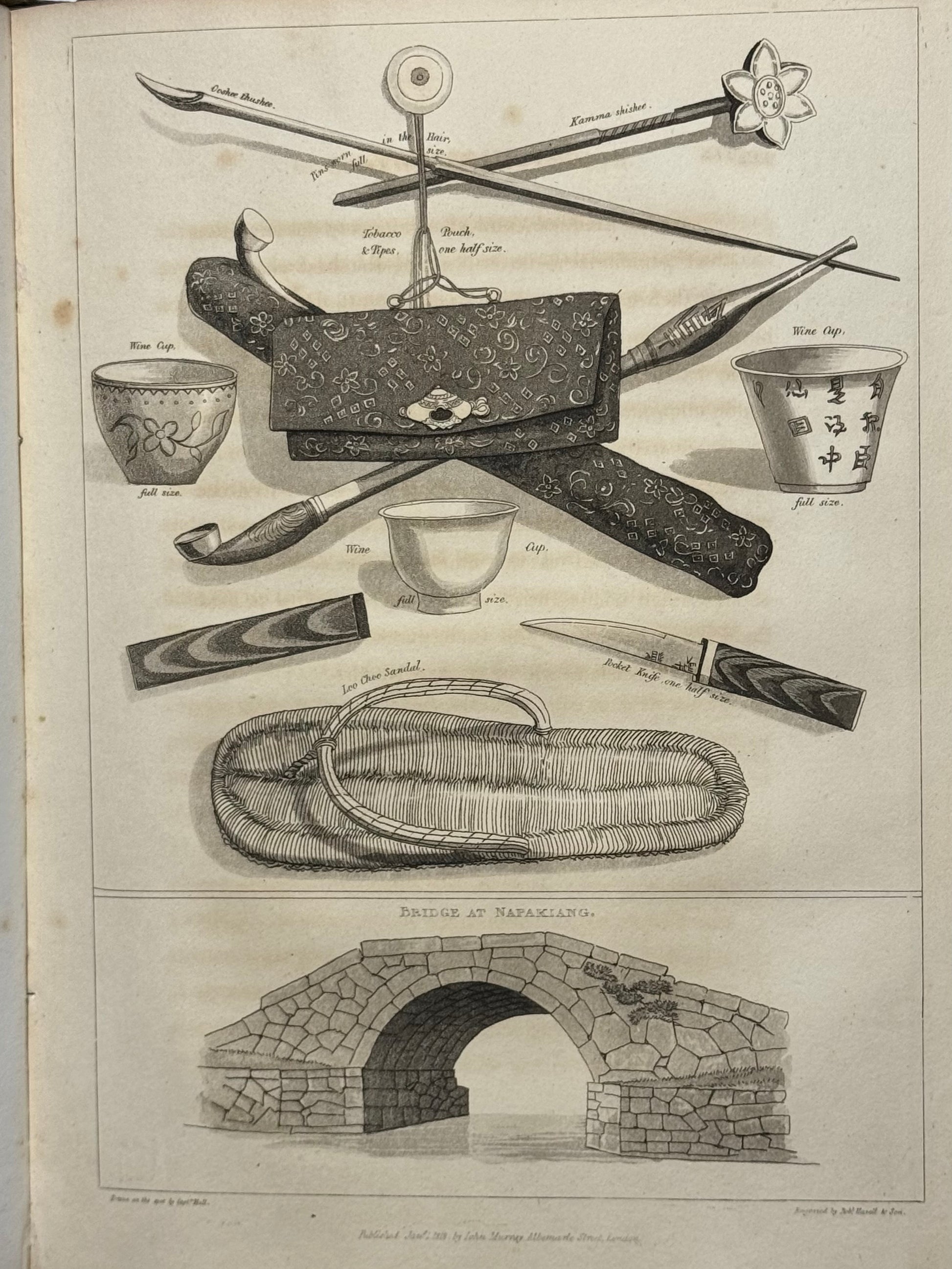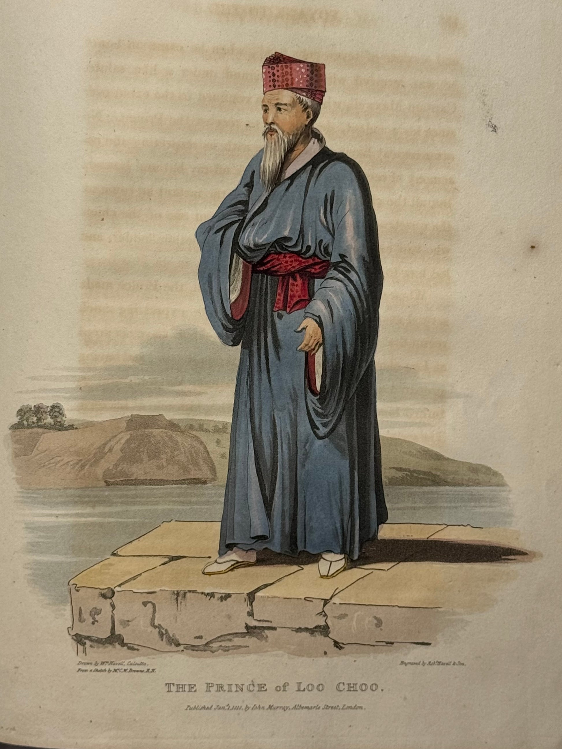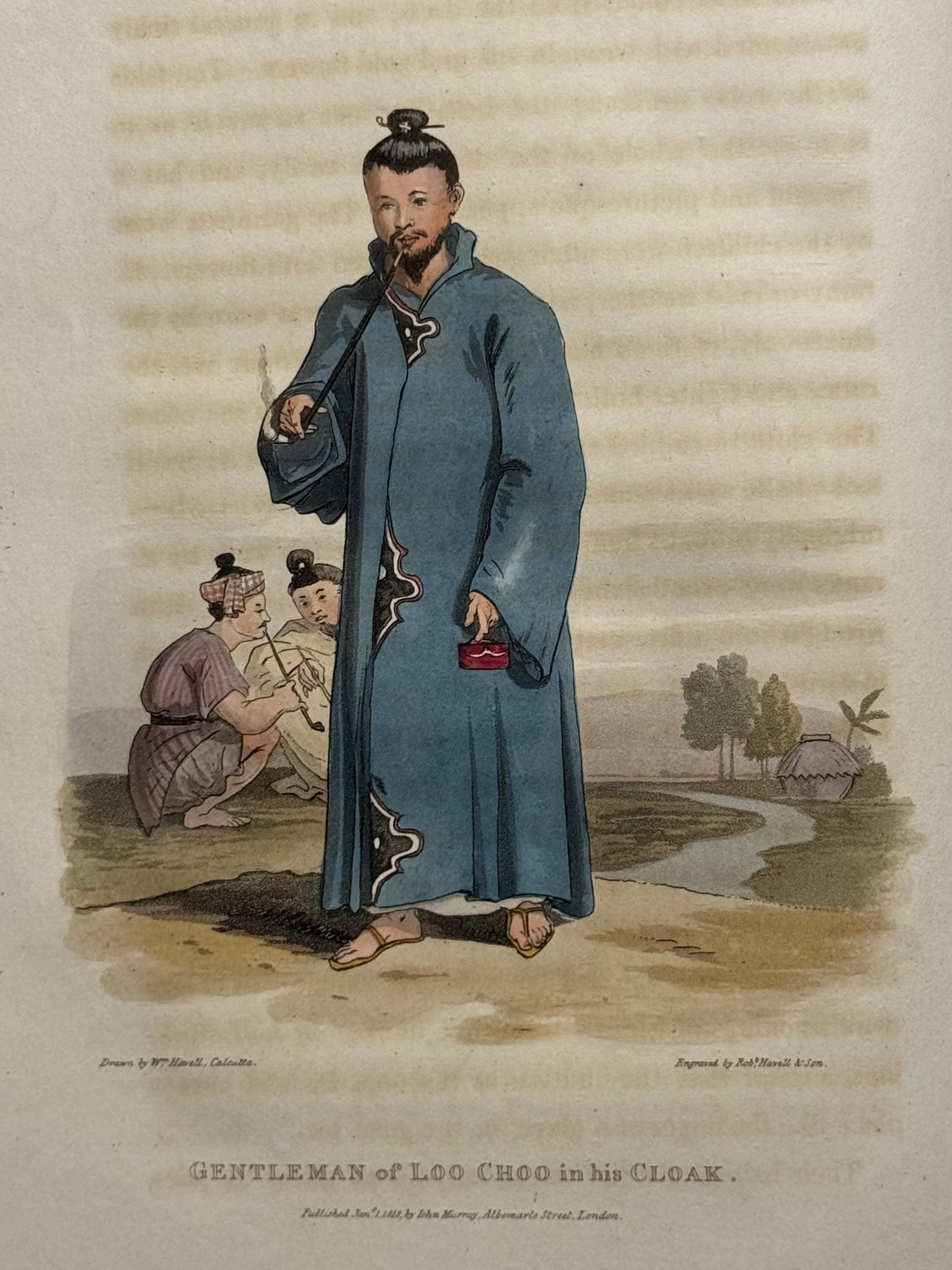 This is the first comprehensive description of the Ryukyu islands by the Europeans. Captain Hall sailed in the ship the Lyra, alongside the Alceste as part of the Amherst Embassy to China. After exploring Korea, the East China sea and the Yellow sea, the voyage explored the Ryukyu islands including landing at Okinawa in 1816. His descriptions of the friendly people of the Islands was well received and encouraged further visits, including by Admiral Perry in 1853.