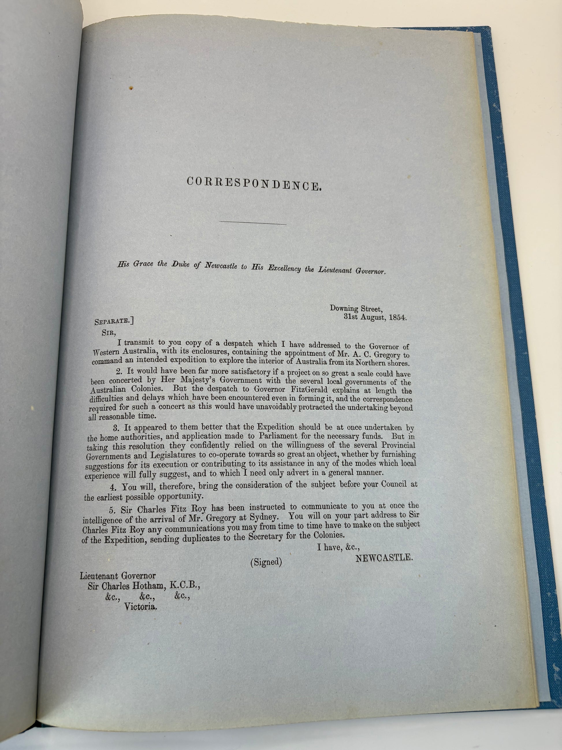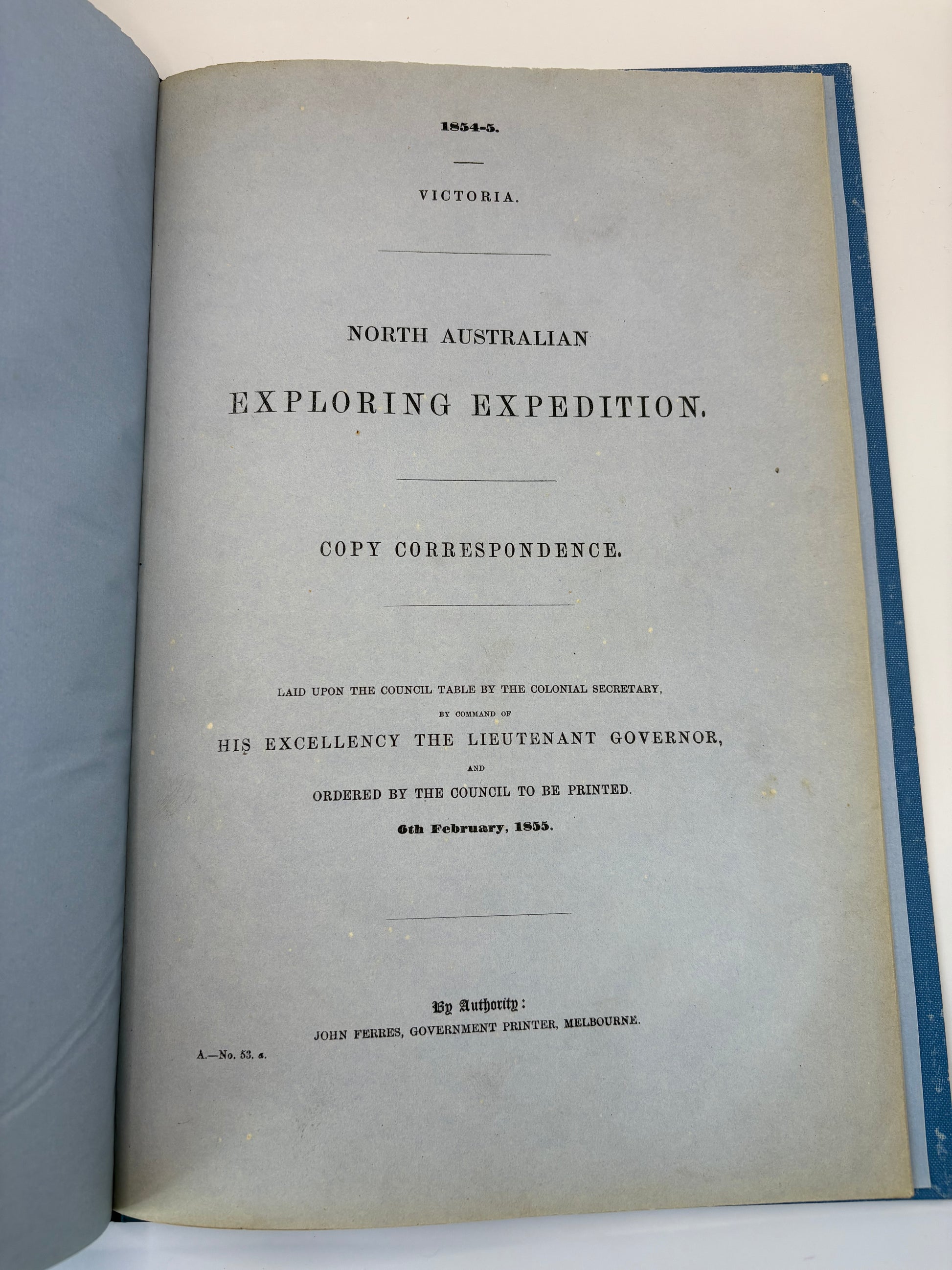 This is the first and only edition of the official correspondence relating to the proposed North Australian Exploring Expedition. It includes letters to the Governor from Captain Stokes, Charles Sturt, and other leading figures of Australian inland exploration. These papers are the official government documents for the expedition planning phase. Routes, command structure, logistics, and provisions and discussed in these papers. The document shows Melbourne’s attempt to position itself at the forefront of exploration in the years preceding Burke and Wills