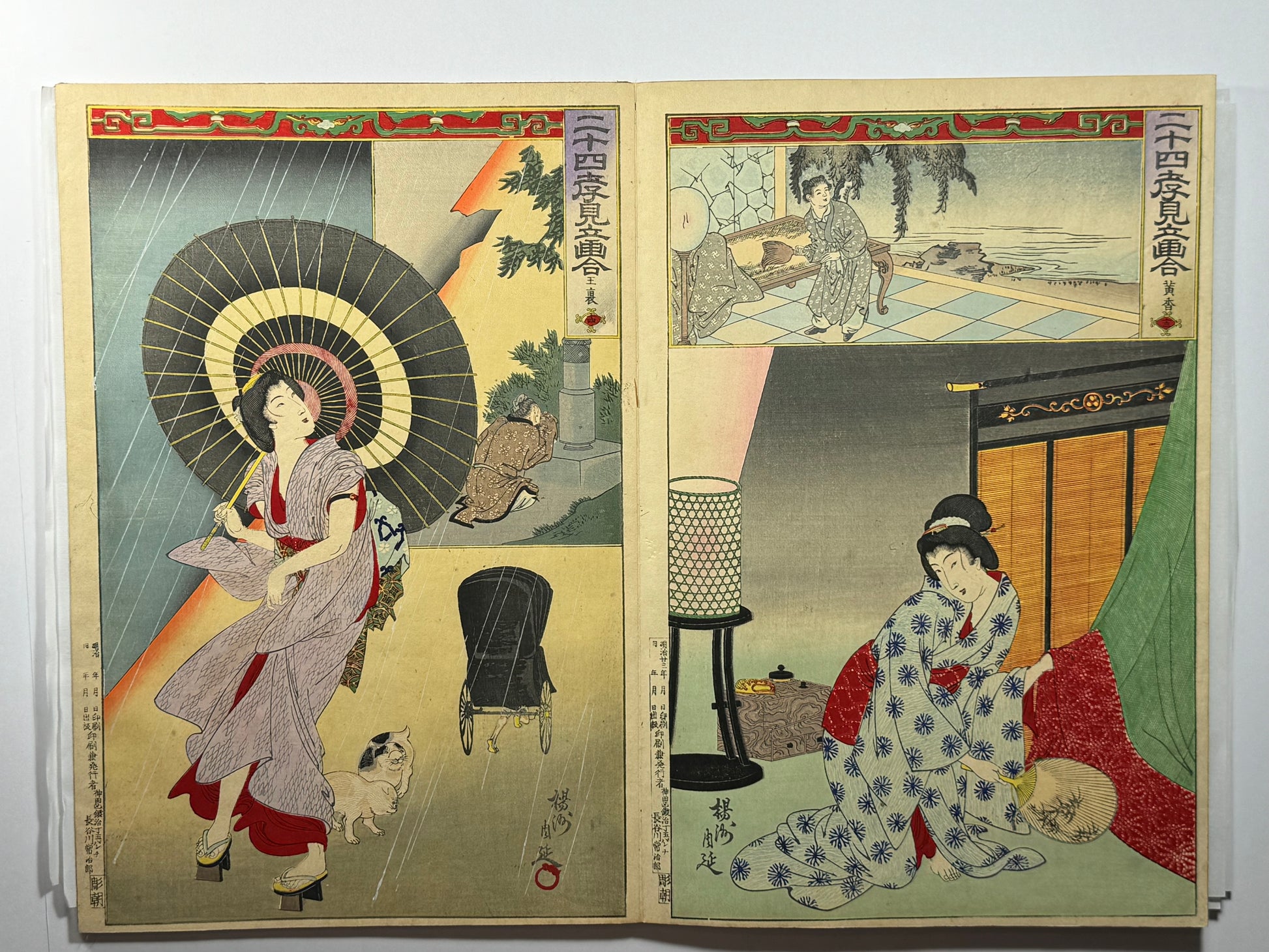 Silk board covers to accordion album. The images are vividly designed with bright colours, lively scenes, and a wealth of detail. Each image shows a lady in a Japanese setting with a second inset image giving a backdrop to the story. Very good condition – images backed in album.