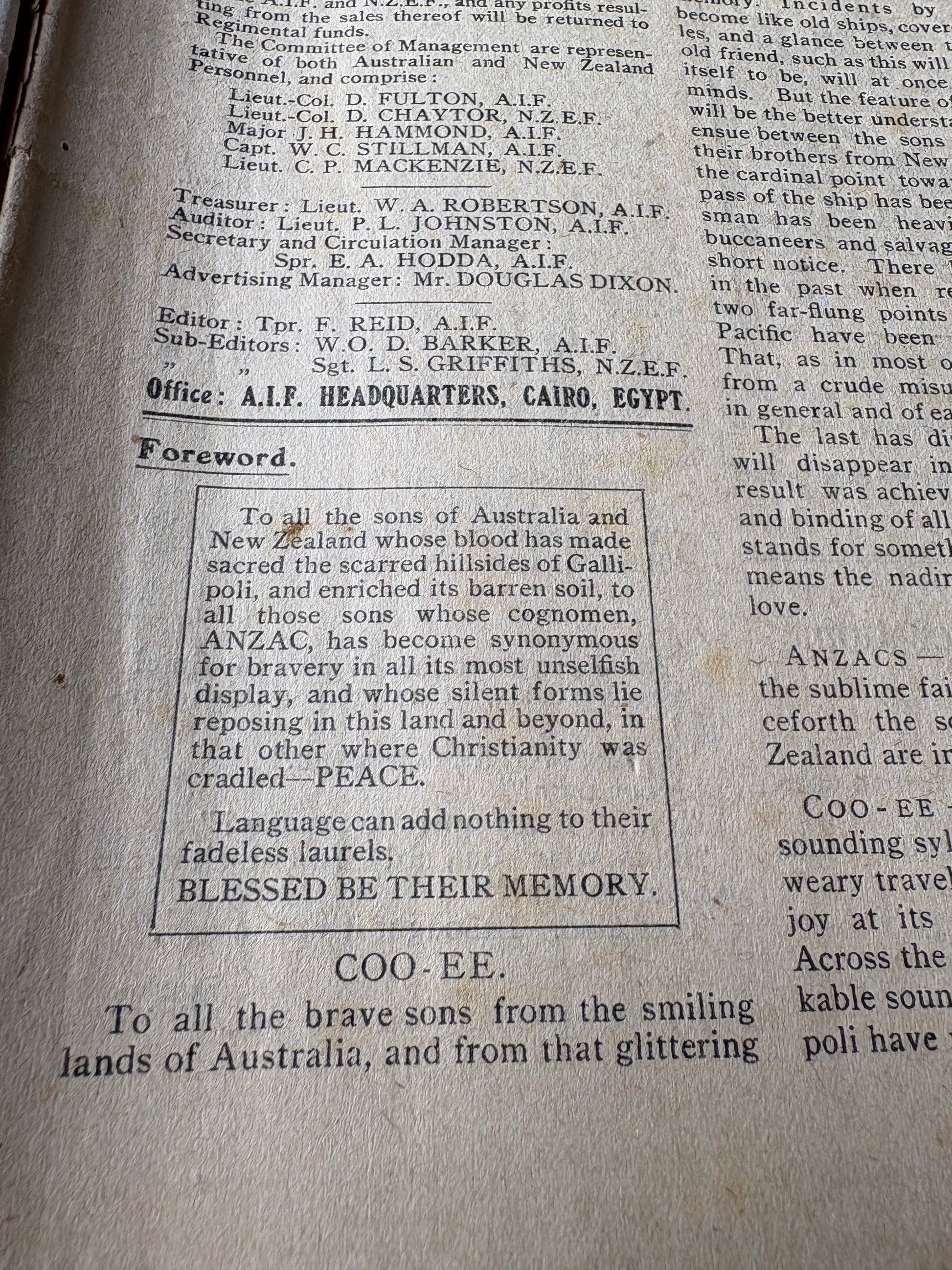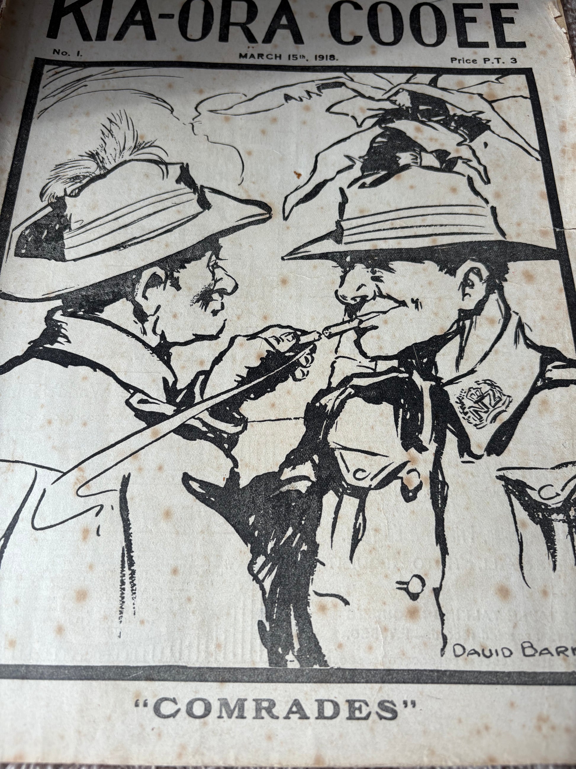 This iconic ANZAC publication was the official soldier's magazine in the Middle East during WW1. Written by soldiers, it has a humorous outlook on war and demonstrated the building camaraderie, and identity formation, of the Australian and New Zealand ANZAC soldiers. The title Kia-ora reflects the Māori greeting, while Coo-ee was an Australian greeting often used in the bush. This iconic publication is one of the most desirable and iconic ANZAC publications.