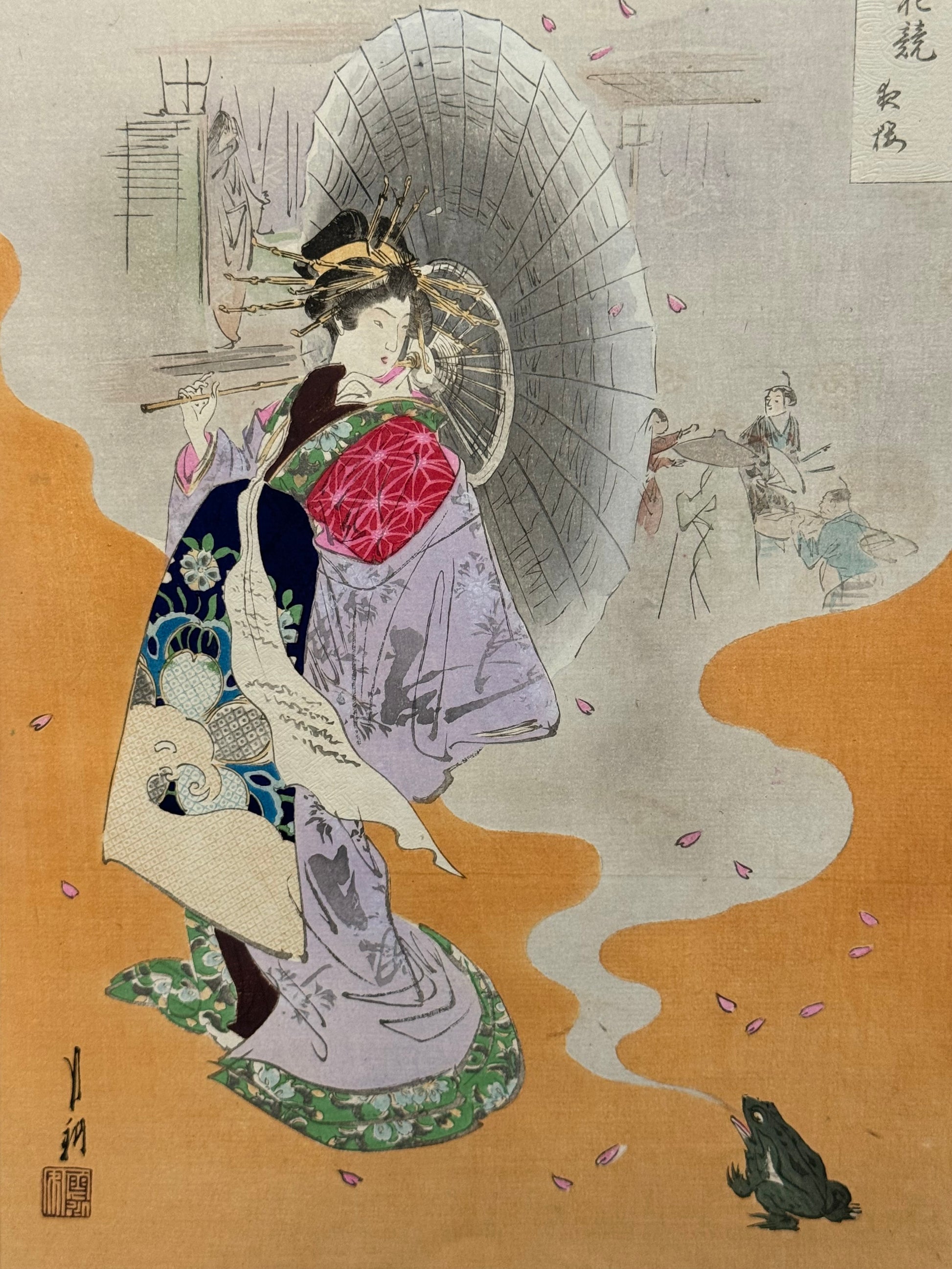 Gekko’s name “moonlight” reflects the ethereal and dreamlike format of his compositions. Growing up during the Meiji period he witnessed the rapid industrialisation and changes of Japan from its Samurai traditions, and he sought to reflect traditional Japanese life. His artistic style was influenced by Western composition theory and the technological advances in ink and printing techniques.