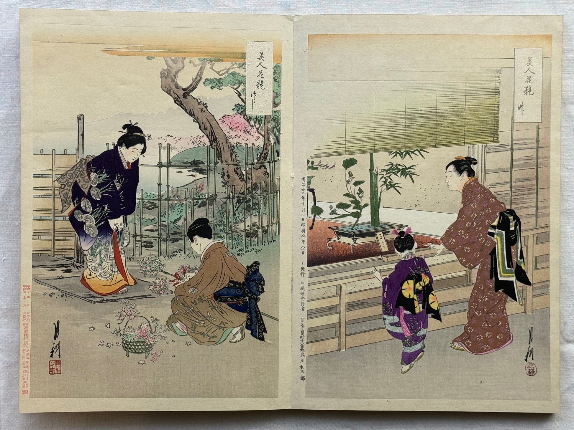 This beautiful series compares beautiful women “Bijin” to flowers. It was printed to a high standard with vibrant colours and the use of bokashi, varied textures and mica printing. The 24 scenes show women in floral scenery with Irises, Cherry Blossoms, Orchids and Willow trees. Scenes are often homely and also include children, cats and dogs, and even a frog. Many scenes are set in traditional Japanese homes, formal gardens or with peaceful rural backdrops.