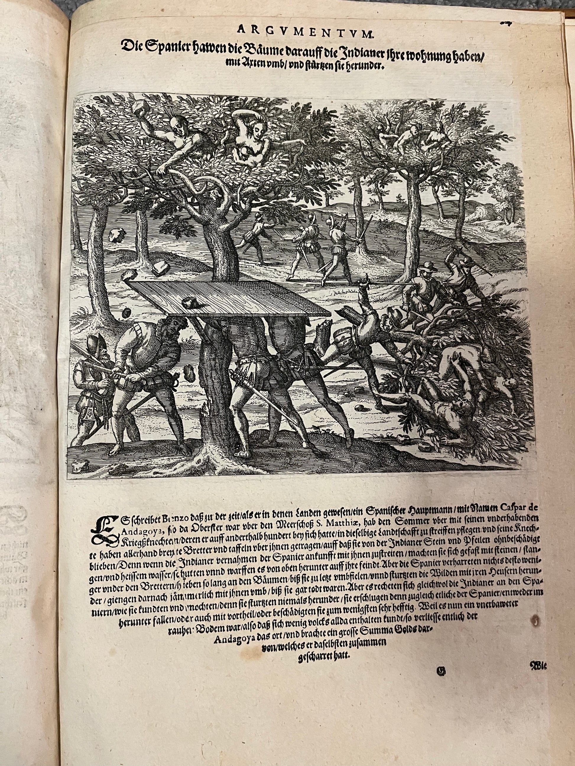 Benzoni, an Italian, acted as a mediator between different nations. The work describes life of the first nations of Central America. Benzoni wrote at a time when the Spanish treatment of the Indians was a concern, and described the cruelty of the Spanish towards the Indians and African slaves - the famous "Black legend". The work is beautifully illustrated with engravings of the Native Americans and Spanish conquistadors. It including images of Nicaraguans dancing, how they held their markets, and made war, and of slaves being harshly treated.