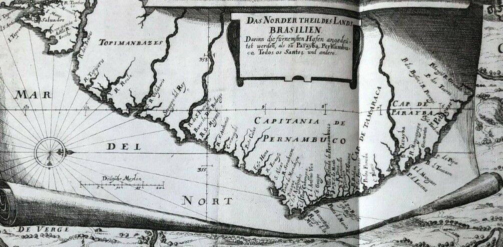 In the upper area of the map the Brazilian coast is shown with the the state of Pernambuco. The map is beautifully designed and rich in detail.