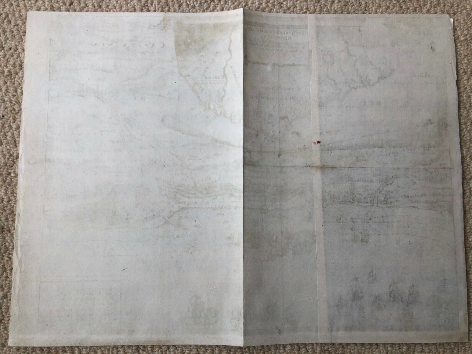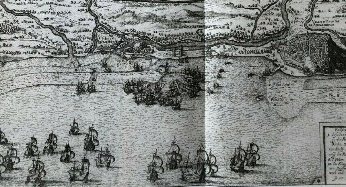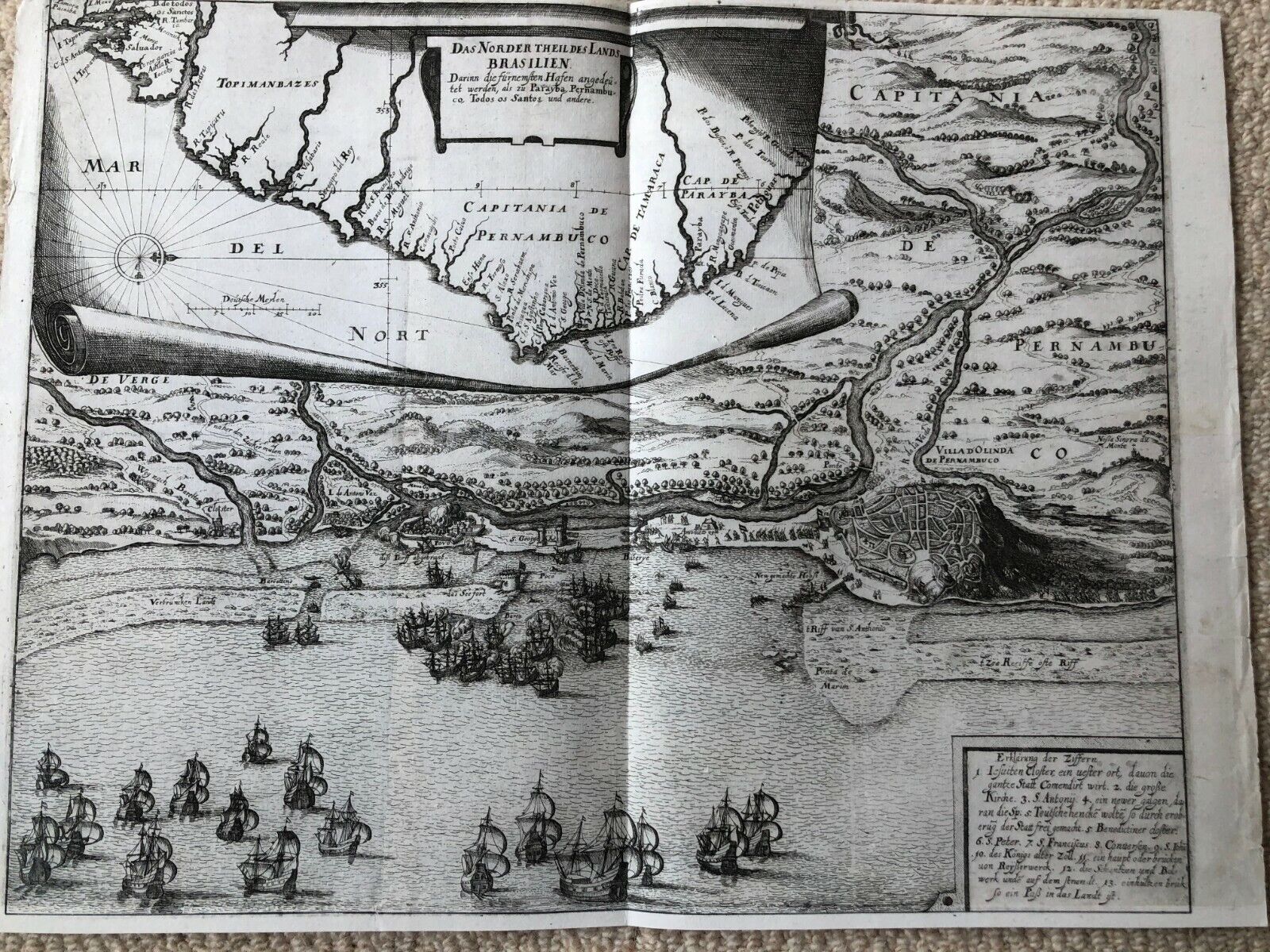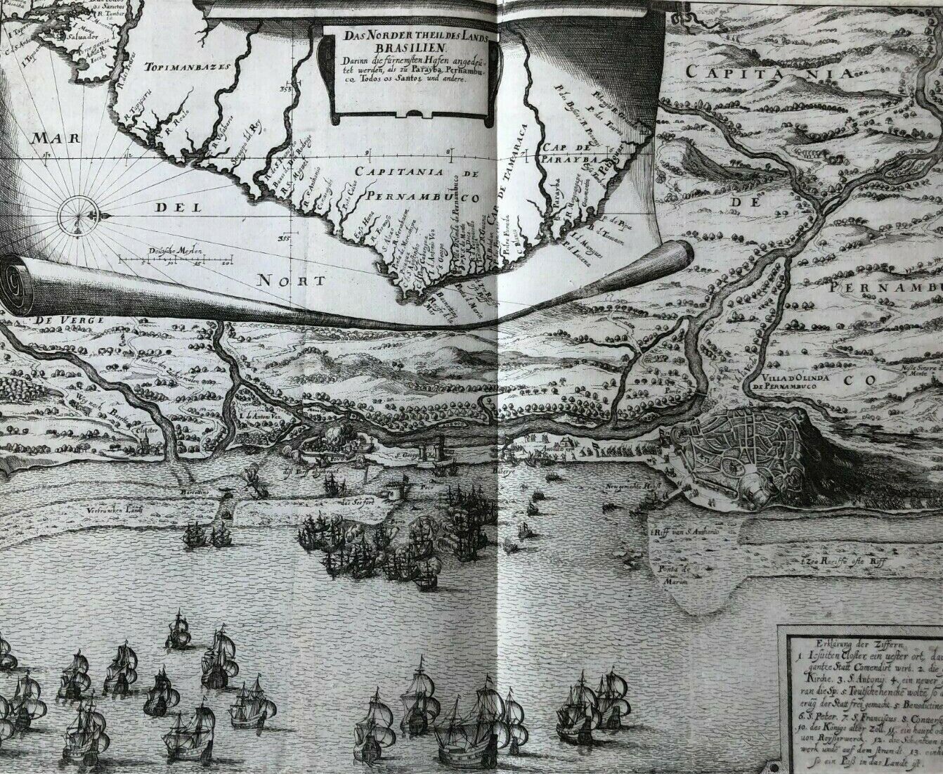 The engraving shows the Dutch invasion of Olinda, in Pernambuco, which took place in 1630. The Dutch were fighting to gain control of the port which was the gateway to the largest sugar producing region in the world. 65 ships, under the command of Hendrick Corneliszoon Loncq succeeded in capturing the port from the Portuguese. In the short term, the Dutch were successful in controlling trade in Brazil. But after a significant loss in 1649, the Dutch gradually gave back control to the Portuguese, eventually formally withdrawing in 1661.