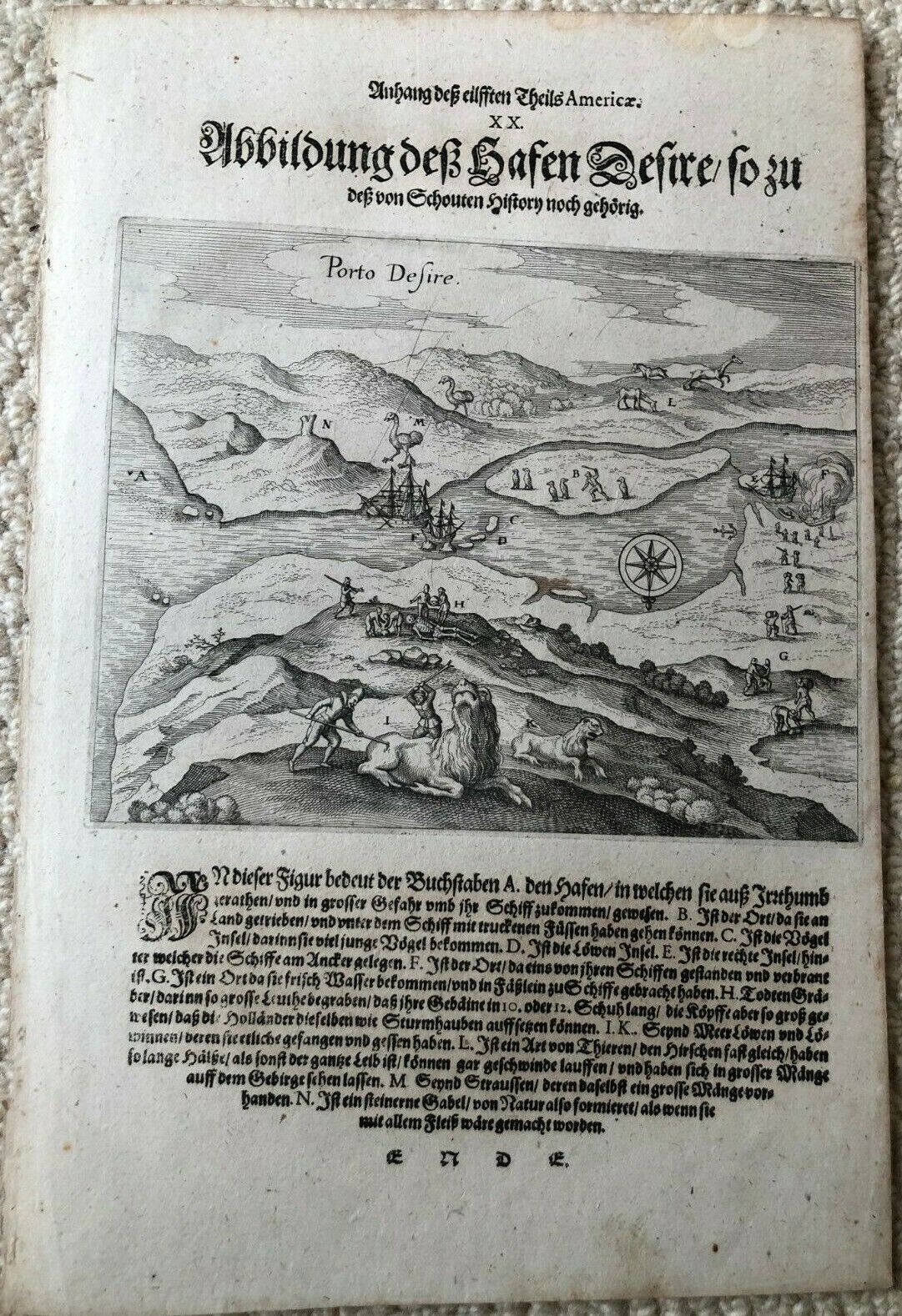 This is an original plate from the Appendix of Part 11 of De Bry's famous set of "Grands Voyages". This part contained a Description of Schouten and Le Marie's famous voyage of 1615-17. Attempting to break the VOC's monopoly on the Spice trade, they formed the Australian company which attempted to join the spice trade by sailing East, past South America, rather than to the West around Africa. In the ships Eendracht and Hoorn they sailed around Cape Horn and across the Pacific, being the first Westerners to reach Tonga and the Cocos islands. After reaching the Spice Islands they were arrested for breaking the VOC's monopoly, and eventually sailed back to Amsterdam via the Strait of Magellan with Van Spilbergen.