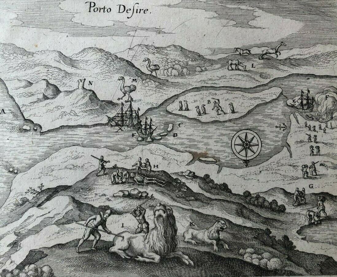 "On 8th December 1616, they reached Rio Deseado, where they stayed to carry out repairs and to stock up with food and water. While laid up, the Dutch saw some strange things, including a burial ground, where they uncovered skeletons up to twelve feet in length, the skulls of which could be worn like helmets.* They caught and ate sea lions and many kinds of birds including penguins, and in the mountains they came across many deer-like animals with long necks (Llamas/Guanaco?) and ostriches (Rheas). They also saw a stone, shaped naturally into a fork, which seemed to have been carved with great effort by men. (This rock still exists today)"