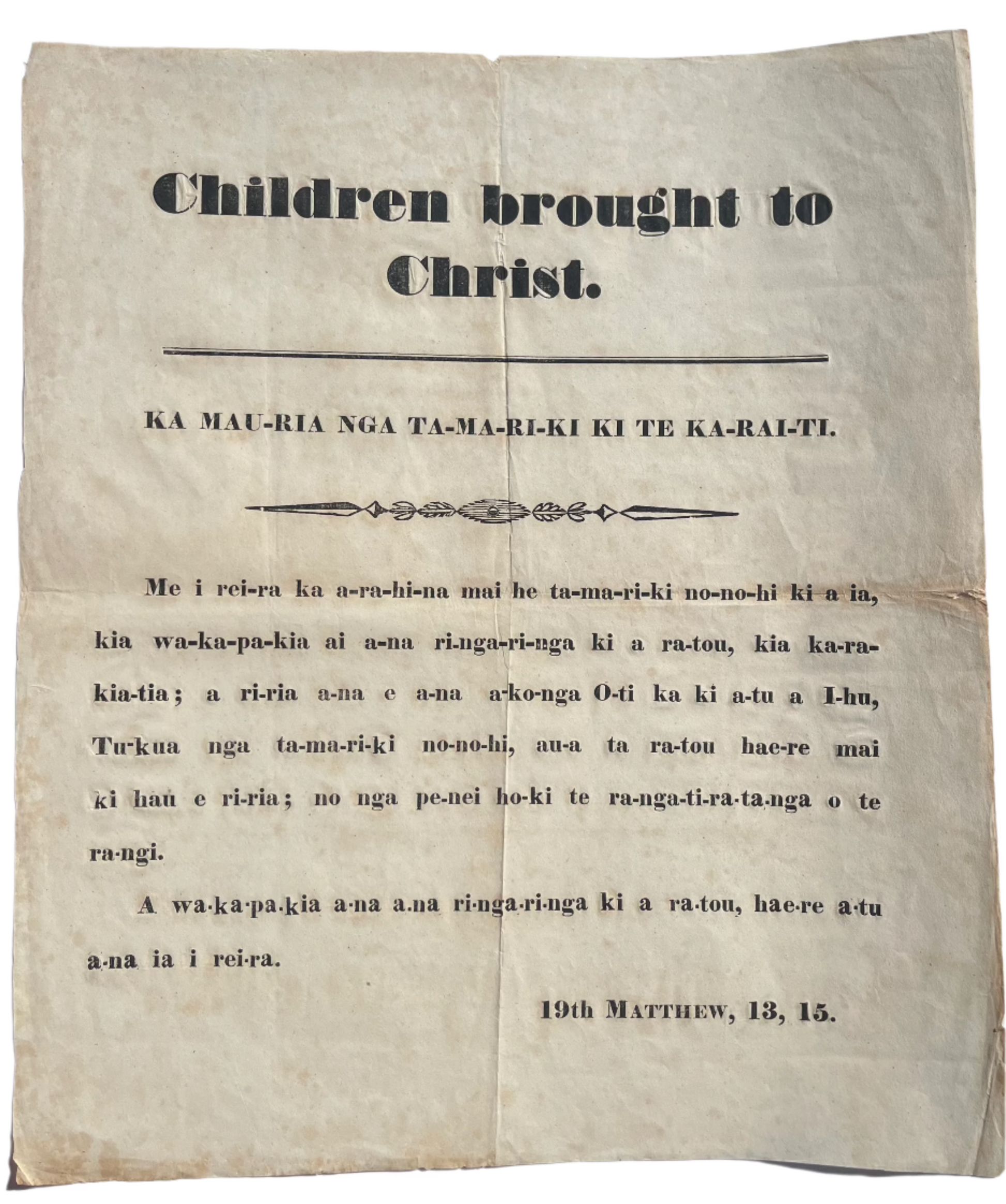 This poster was printed alongside a Māori alphabet for use in Missionary schools. It can be seen that education and literacy were a key part of early Missionary Work in New Zealand. The text from Matthew 19, verses 13-15, encourages the conversion of Children to Christianity: