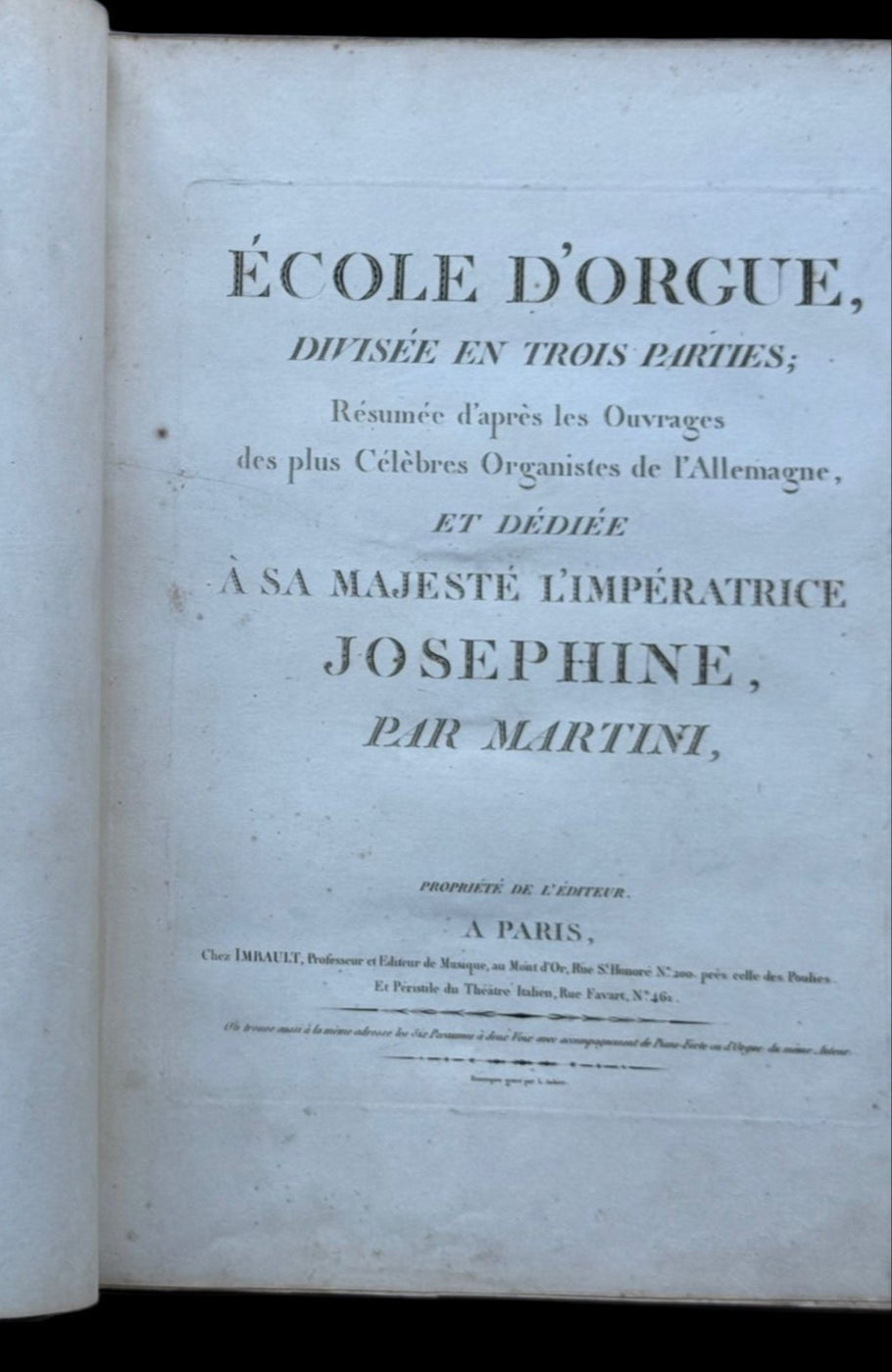 Dedicated to his wife - Josephine - the folio work was published in 1804 and contains Organ music written by Jean-Paul-Egide Martini. The work's dedication to Josephine - who was a lover of music - is a nice touch, although she wasn't an organ player herself!