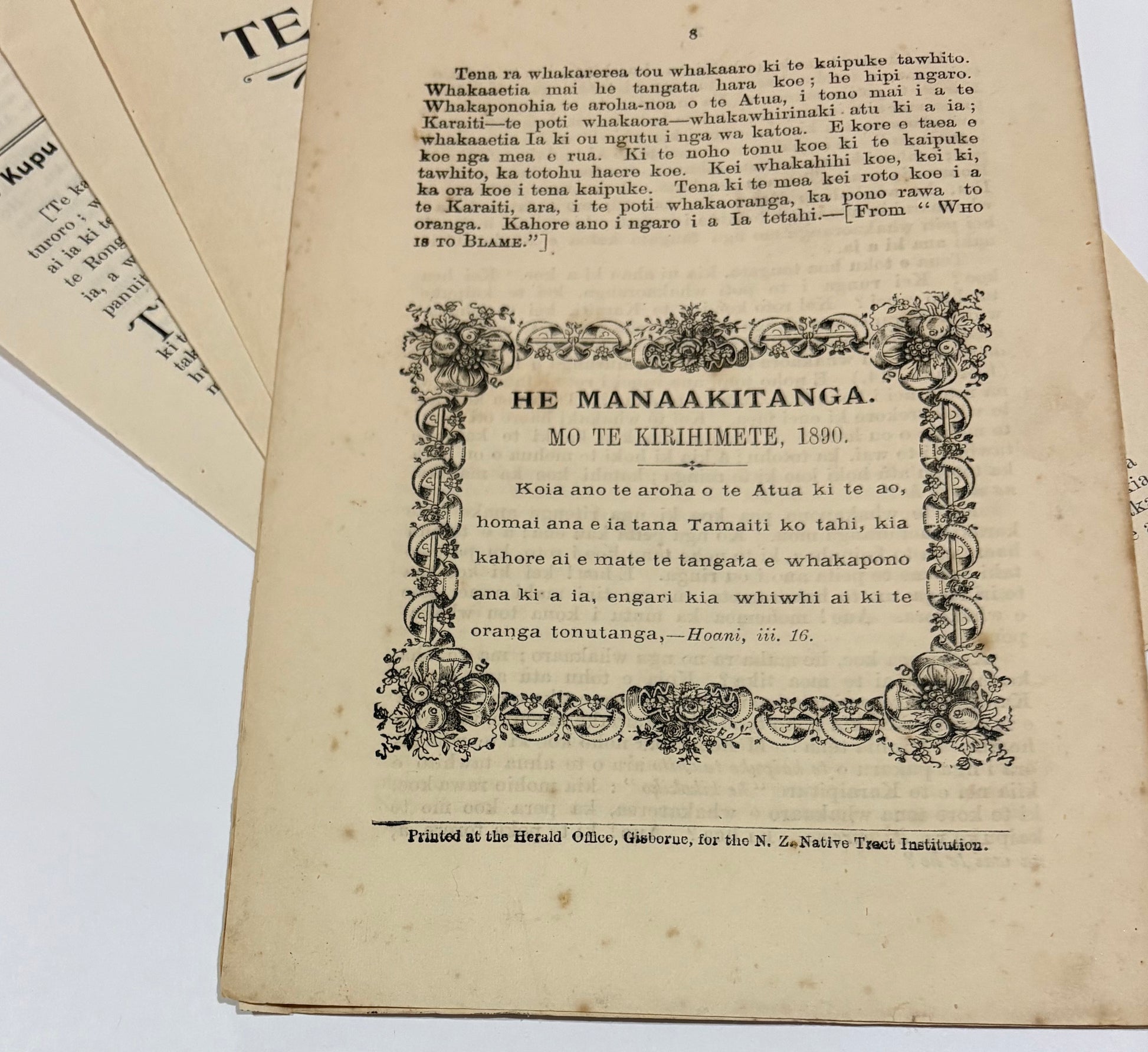 Printed at the Herald Office for the N.Z. Native Tract Institution, Gisborne [N.Z.], 1885.