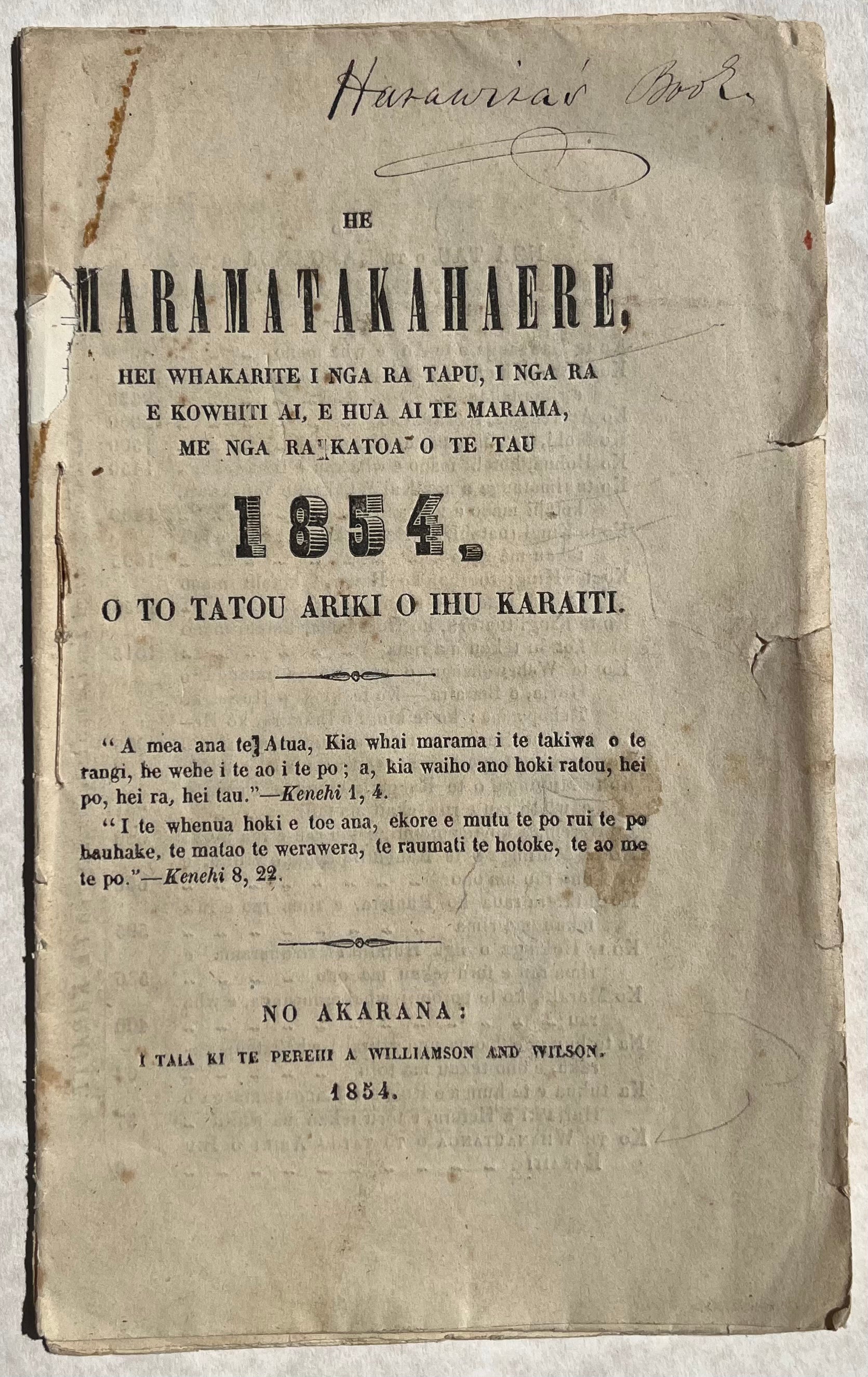“He Maramatakahaere, Hei Whakarite I Nga Ra Tapu, I Nga Ra E Kowhiti Ai, E Hua Ai Te Marama, Me Nga Ra Katoa O Te Tau 1854 O To Tatou Ariki O Ihu Karaiti”