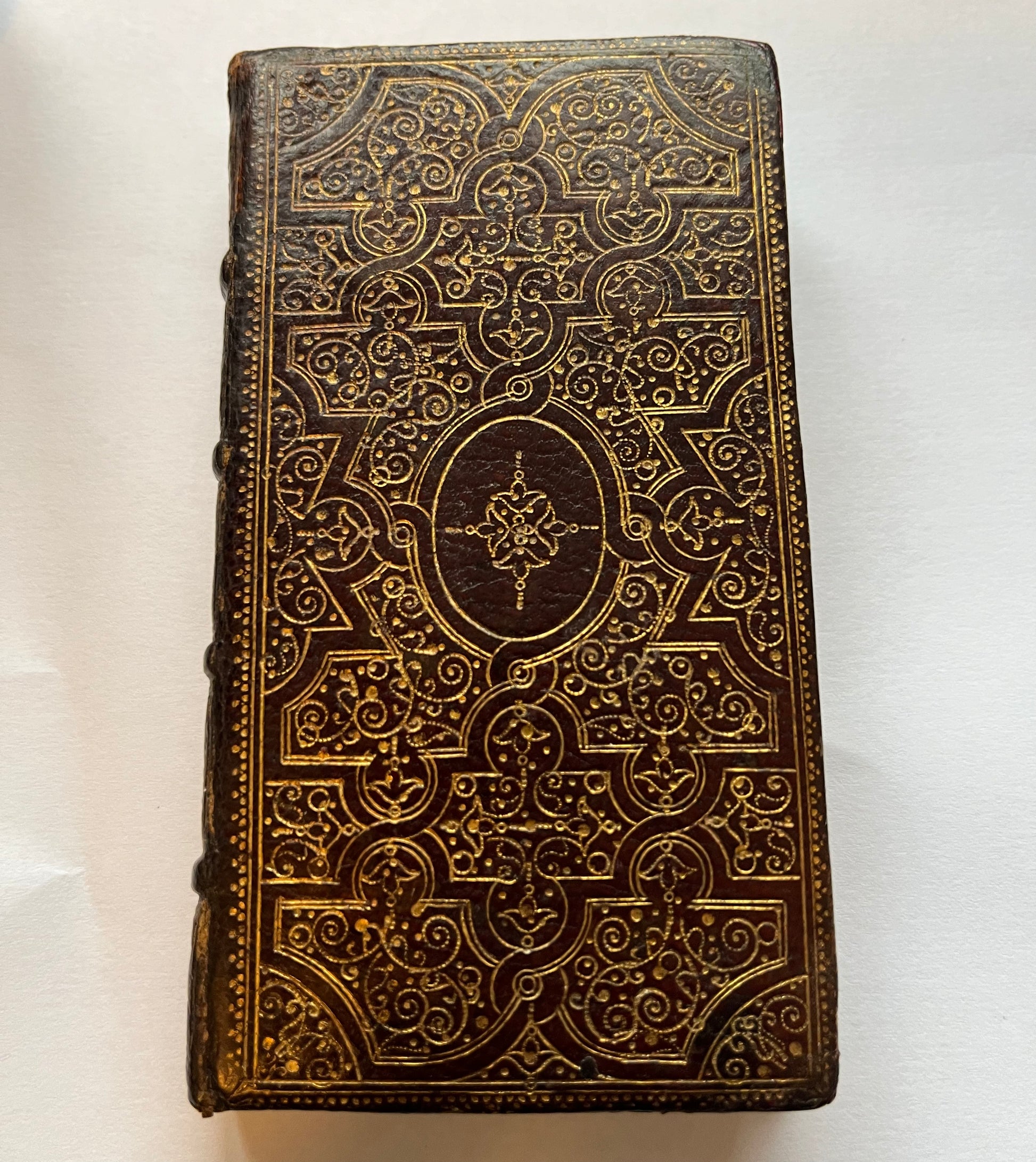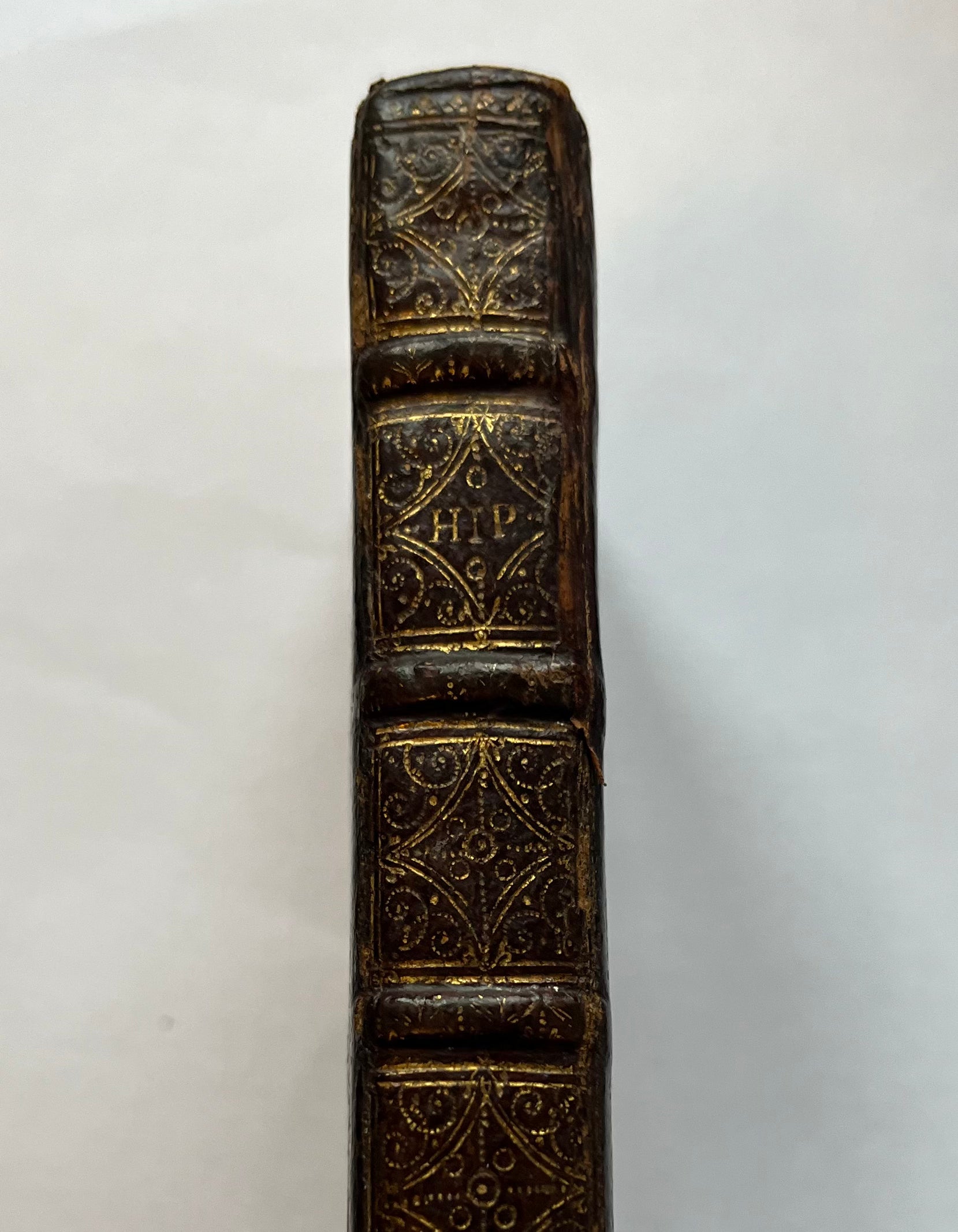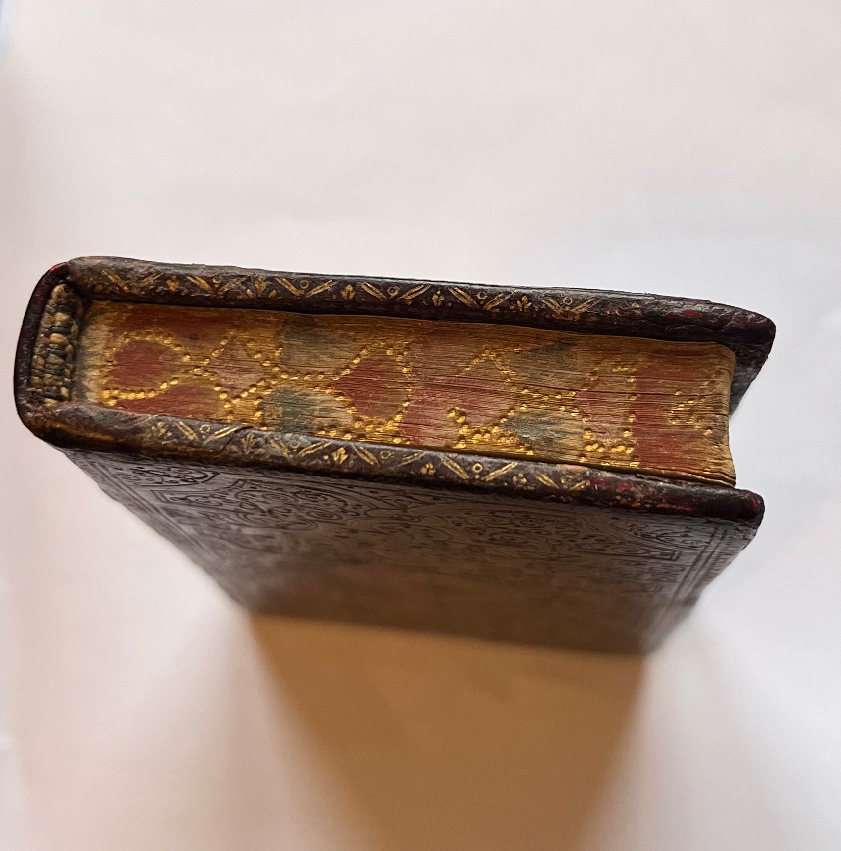 This is a lavish and unusual French binding from the early 1600s. The gauffred edges are delicately decorated with gold, red and blue while the boards have beautiful fanfare tooling in a “Gascon” style. Gascon was a famous French binder of the early 17th century. This book may be by another binder but is contemporary and in a similar style.