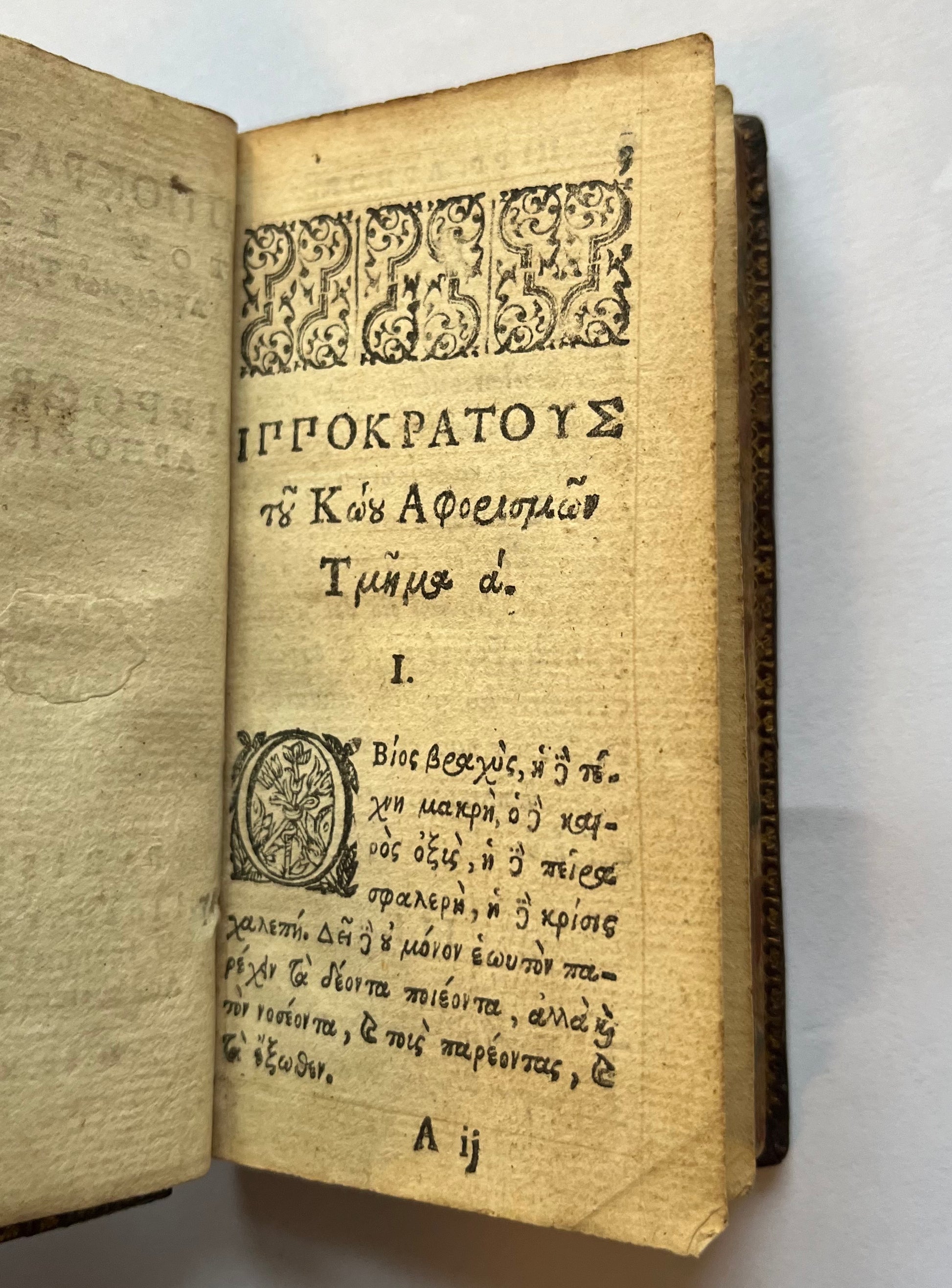 The miniature book enclosed is also interesting being Hippocrates “Aphorisms” and “Prognosticon”. Written around the 5th century BC, they are still relevant today giving important wisdom and insight into medical practice. This edition was published in