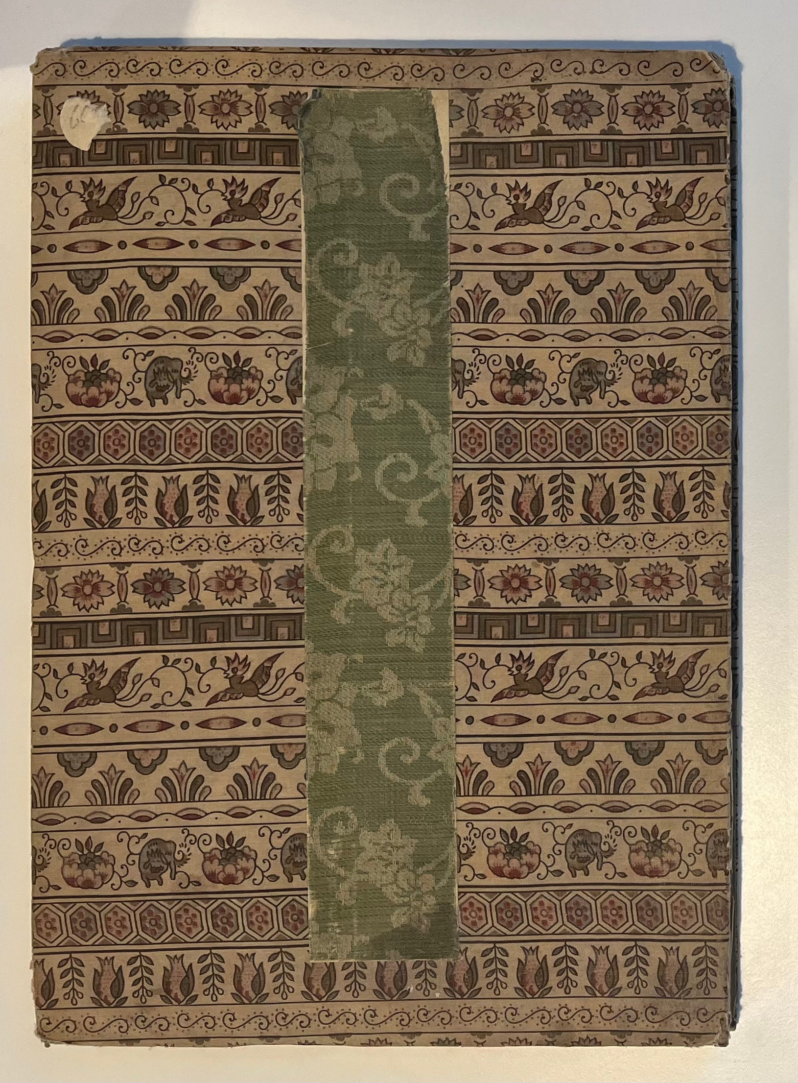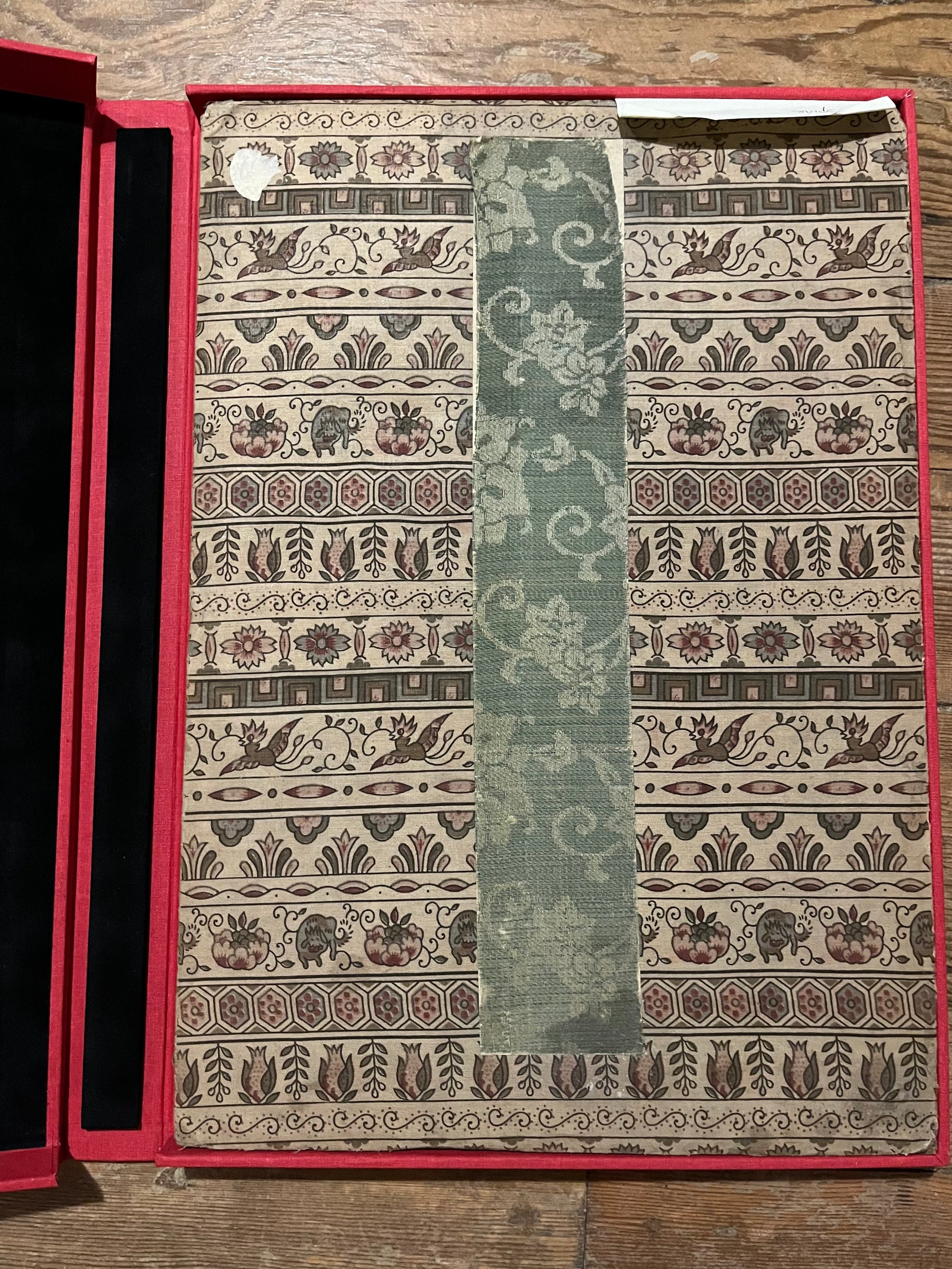Condition: Original decorated silk covered boards with some wear. Restored binding and joins between some prints. Occasional small losses and wear to prints. The prints are backed and bound with some trimming of outer border but no losses to the image or seals. Colours, especially the blues and reds, are bright. Some cross over of red inks to opposite page. Album housed in red solander box.