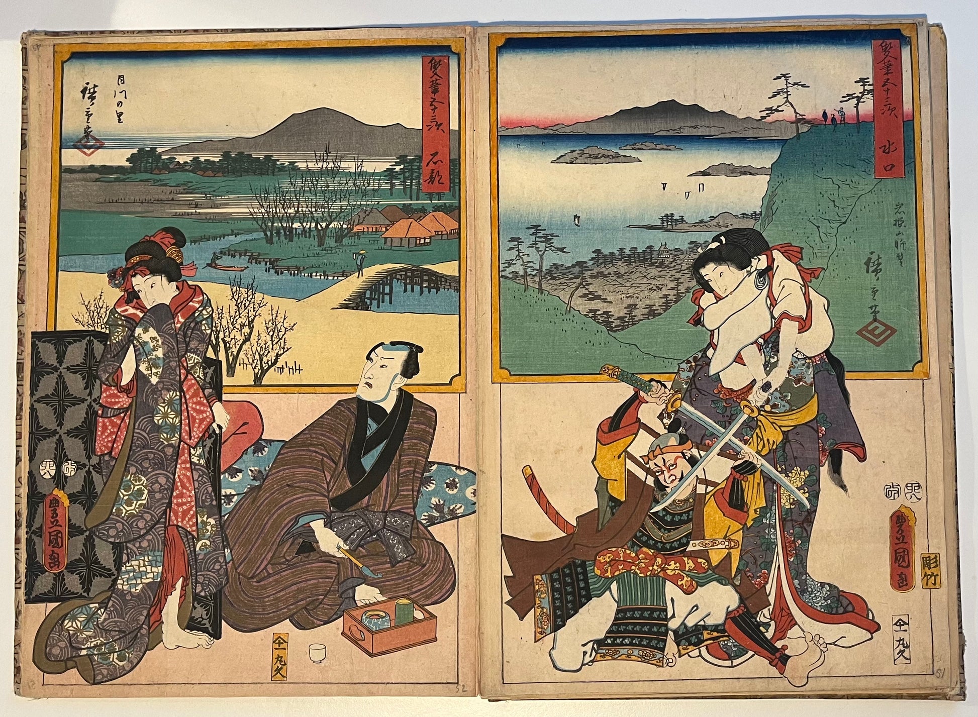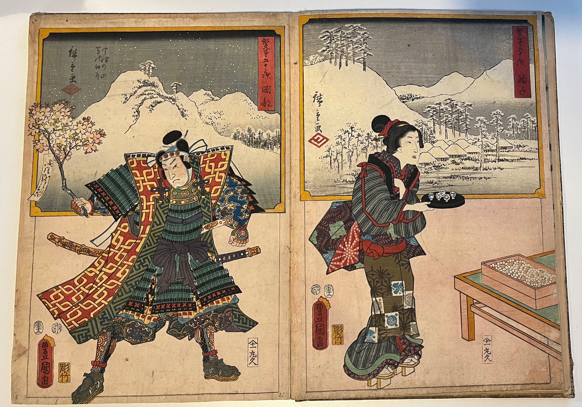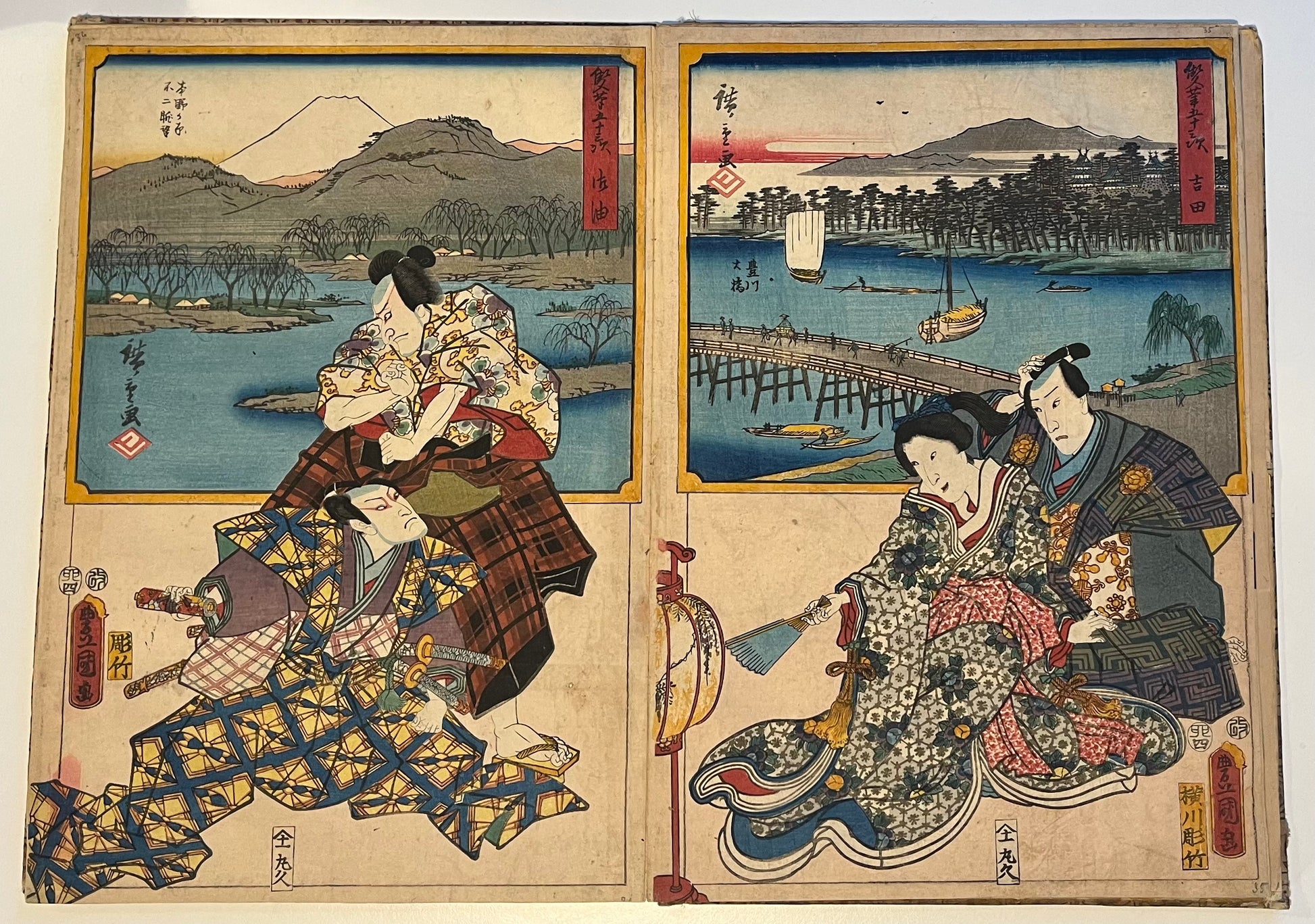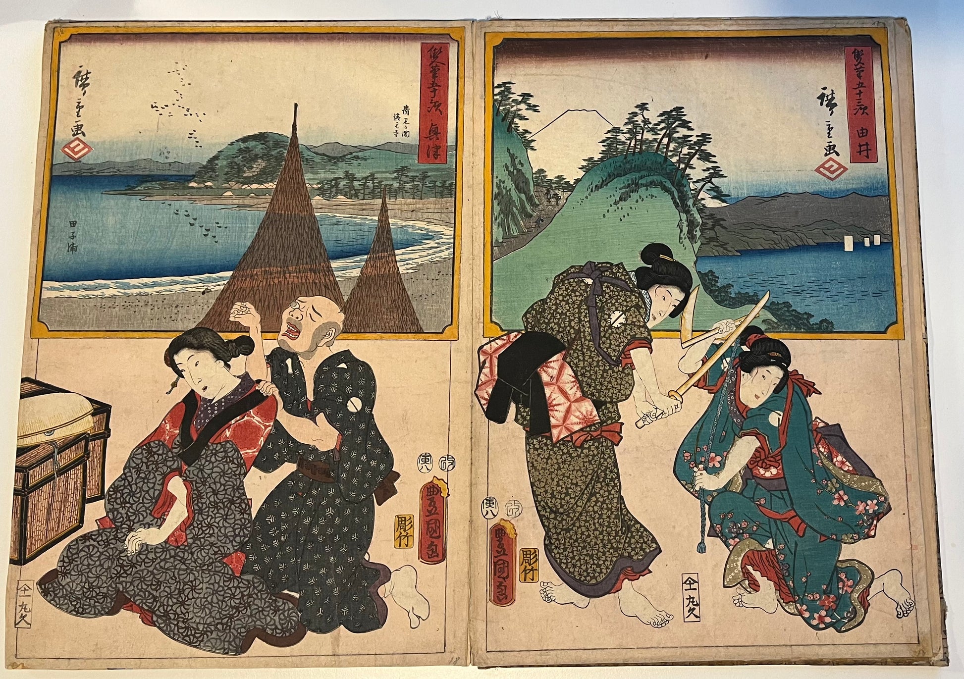 This series allowed the two artists to bring together their skills to illustrate scenes along the Tokaido road. Each scene depicts a half page landscape by Hiroshige alongside a half page image of characters from the region by Kunisada. Some of the most beautiful prints include those with snow filled backgrounds, deep blue seascapes and views of mount fuji.