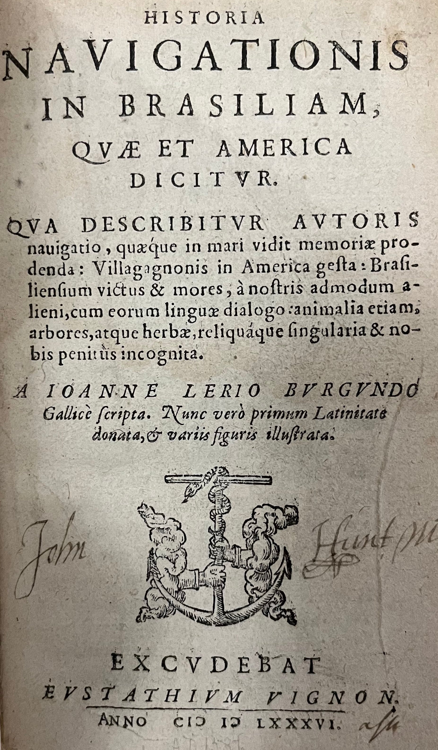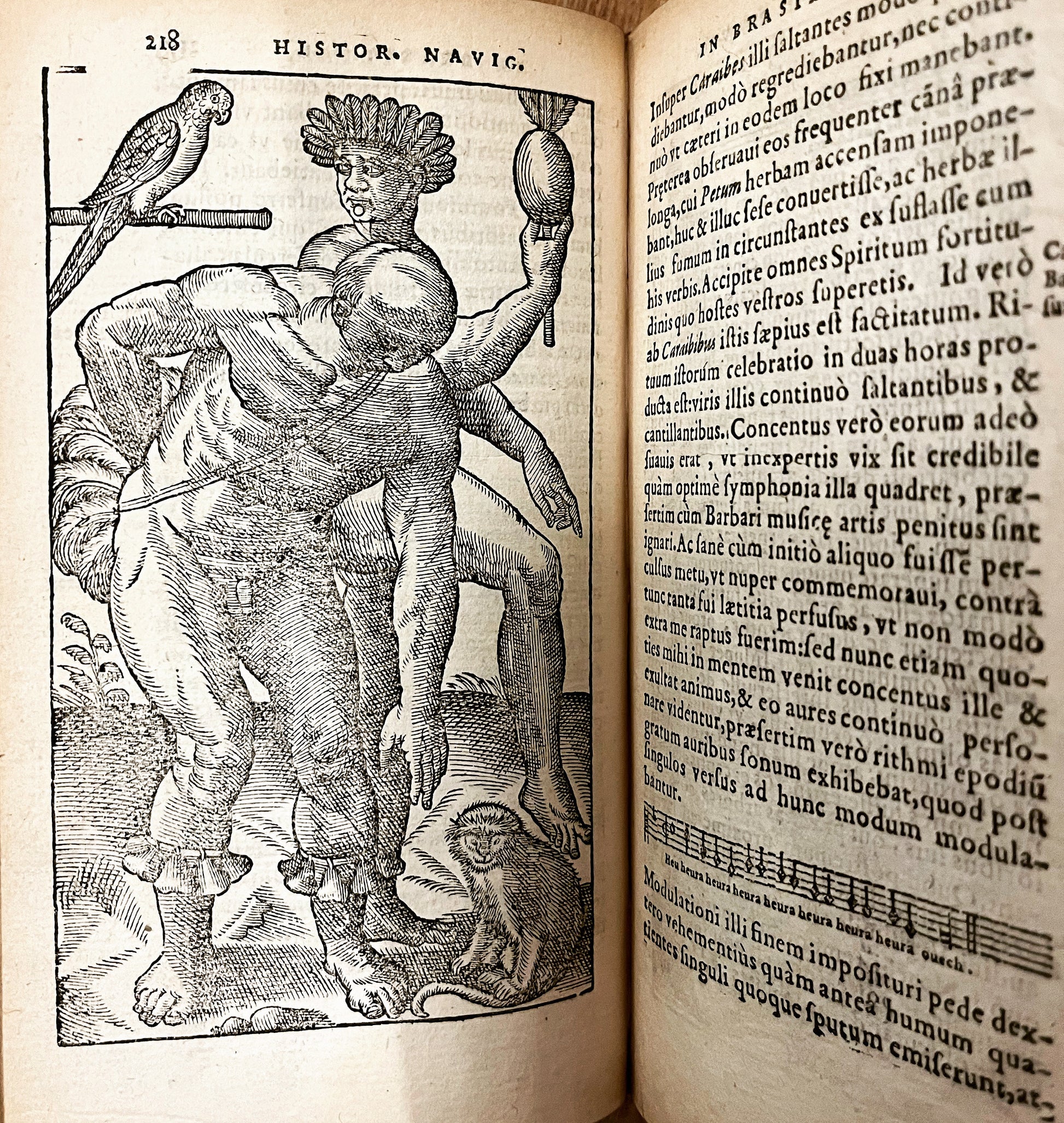 Lery took part in Villegagnon's failed expedition to found a French colony in Brazil - "France Antarctique". This Protestant expedition had set out to escape the French wars of Religion. The colony was founded in present day Rio de Janeiro and Lery spent time exploring the local area. He gives an accurate description of the flora and fauna of the region, but the book is best known for its sympathetic description of the Tupinamba peoples. This is one of the most important early descriptions before increasing European interaction changed their way of life. He records the Tupinamba in engaged in war and cannibalism - which was controversial in Europe on his return. The description greatly influenced later French writers including Levi-Strauss and is still used by modern day anthropologists. Of importance, this edition is one of the first to include notation of Tupinamba music in the text.