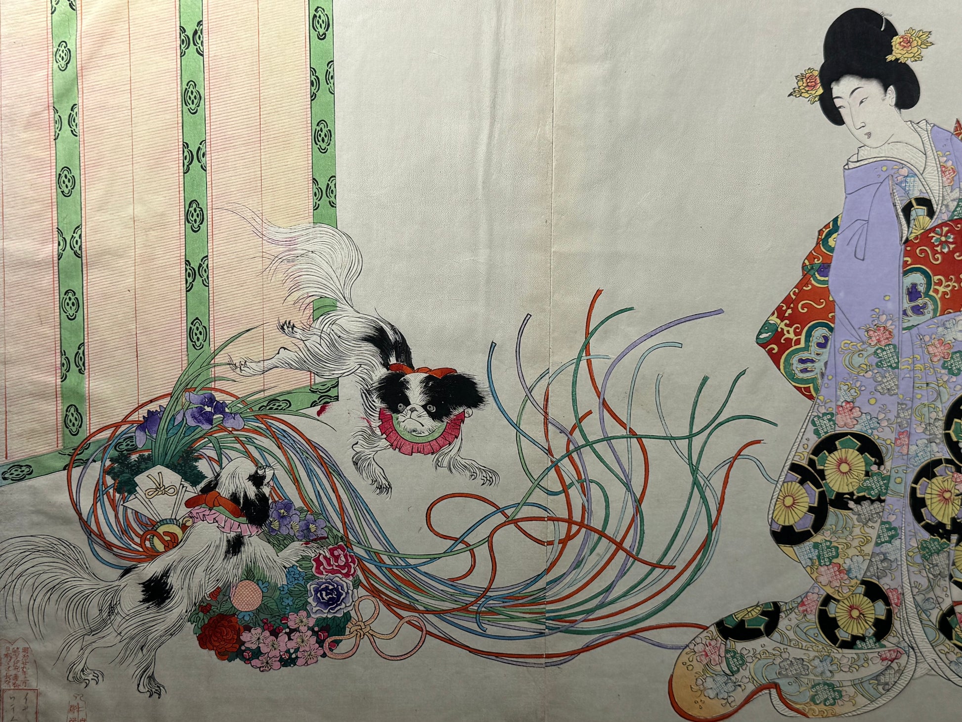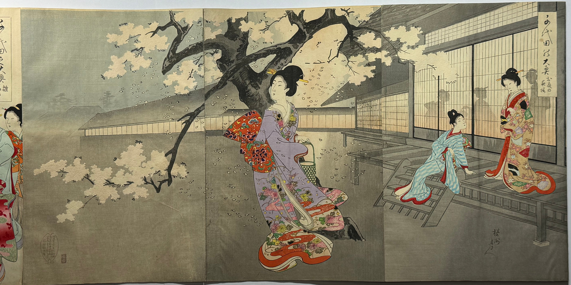 This series focuses on the life of bijin – beautiful ladies of the court. The album includes triptychs of Koto playing, Tea houses, Festivals and a scarce pentaptych of a wedding ceremony. Also included is one Chikanobu’s best triptychs – a night scene which depicts the ”Guard ladies of Chiyoda Palace”