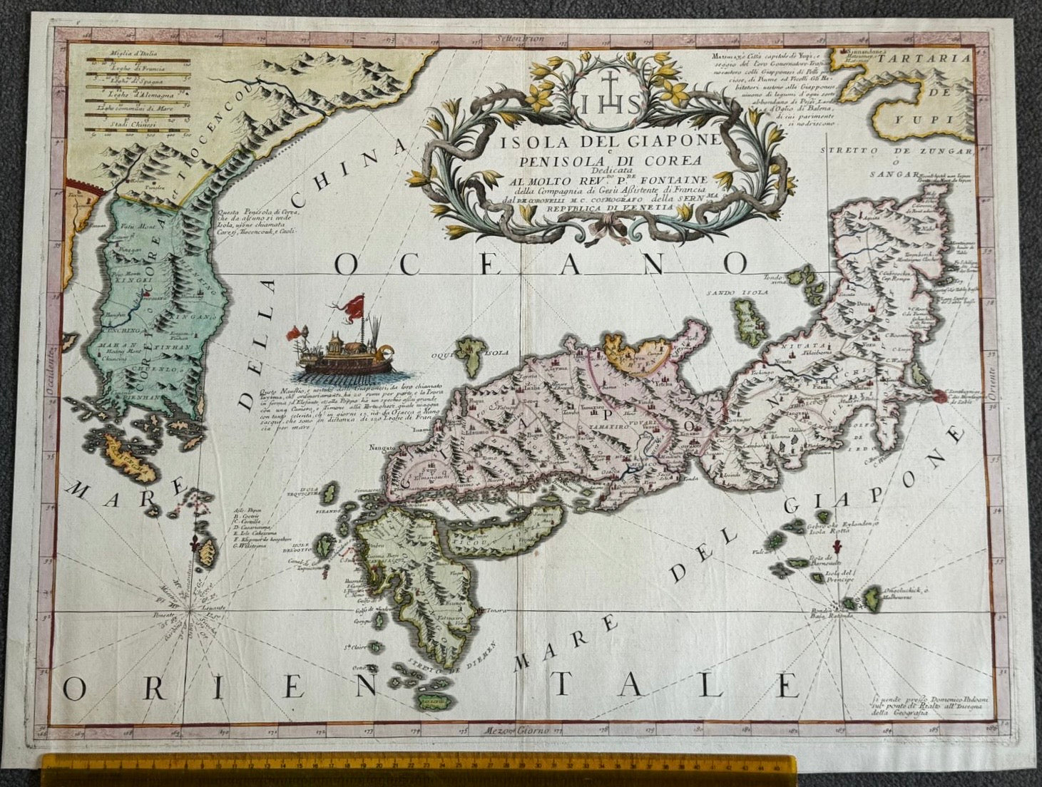 Some nice decorative touches on this map are the Japanese boat with 20 oarsmen, and the Jesuit dedication above the main cartouche.