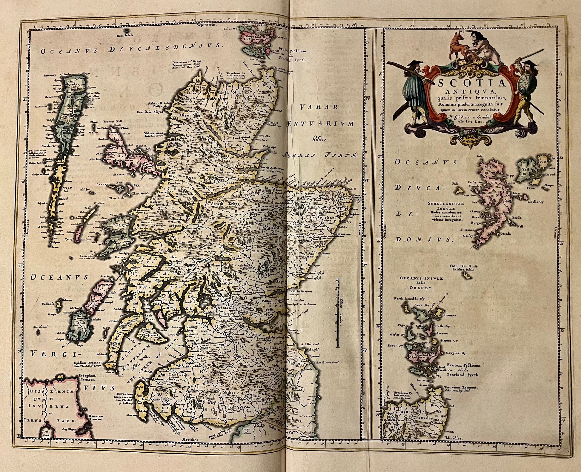 This Atlas is the first Printed Atlas of Scotland with maps engraved by Blaeu and based on drawings by Robert and James Gordon of Straloch. The Maps of Ireland are after Mercator.