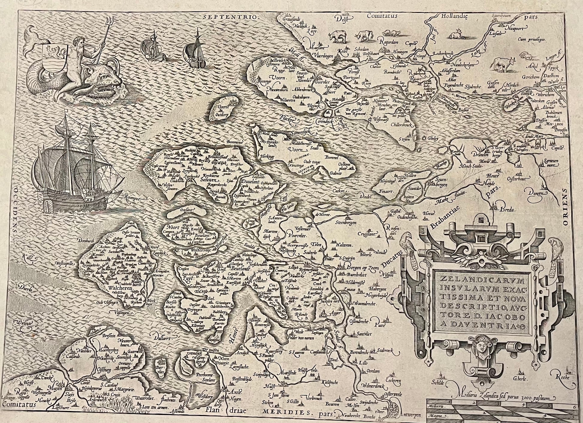 Beautiful early map of Zeeland complete with Neptune riding a Whale(!)