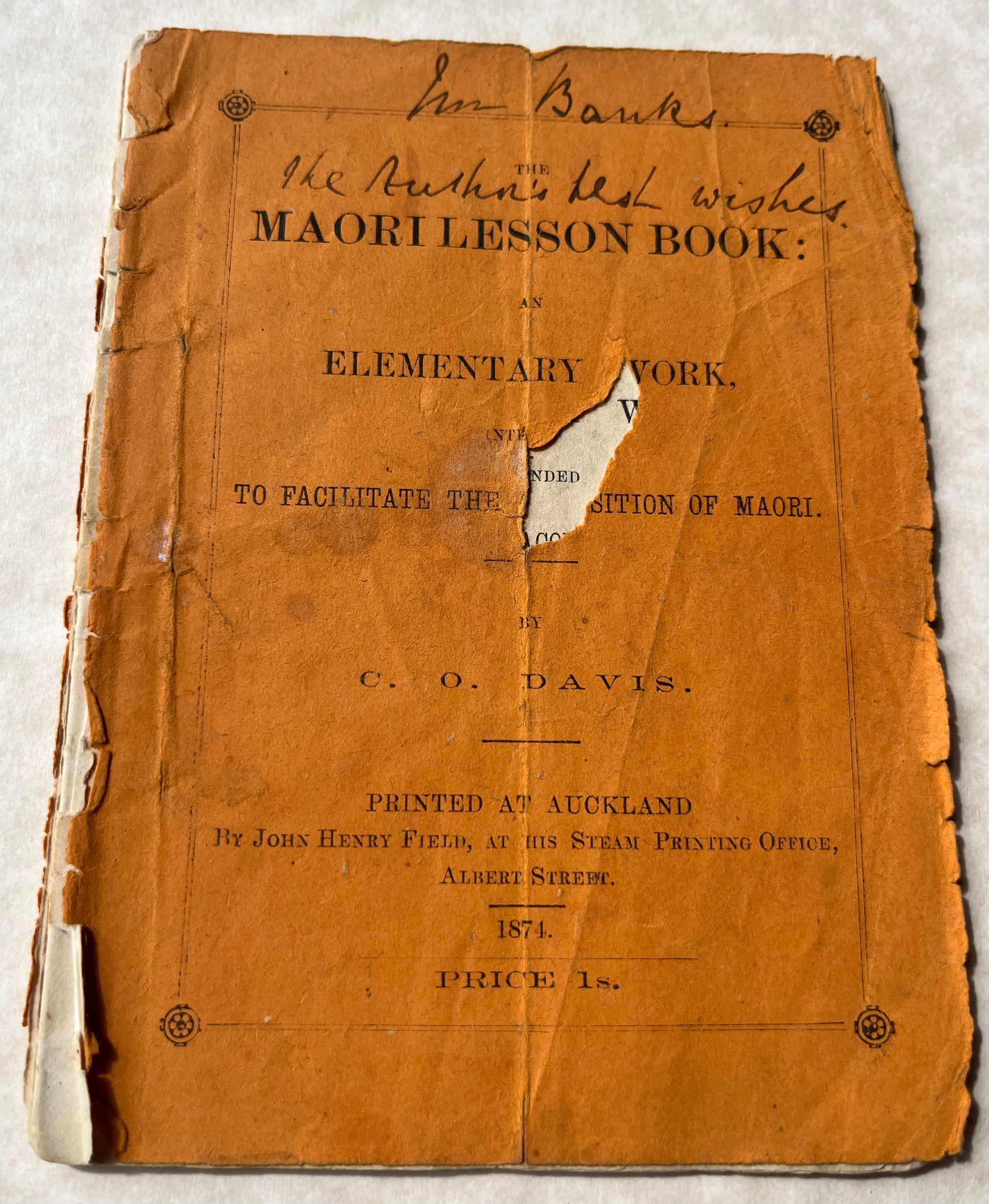 Published in Auckland by John Henry Field at his “Steam Printing Office” in 1874