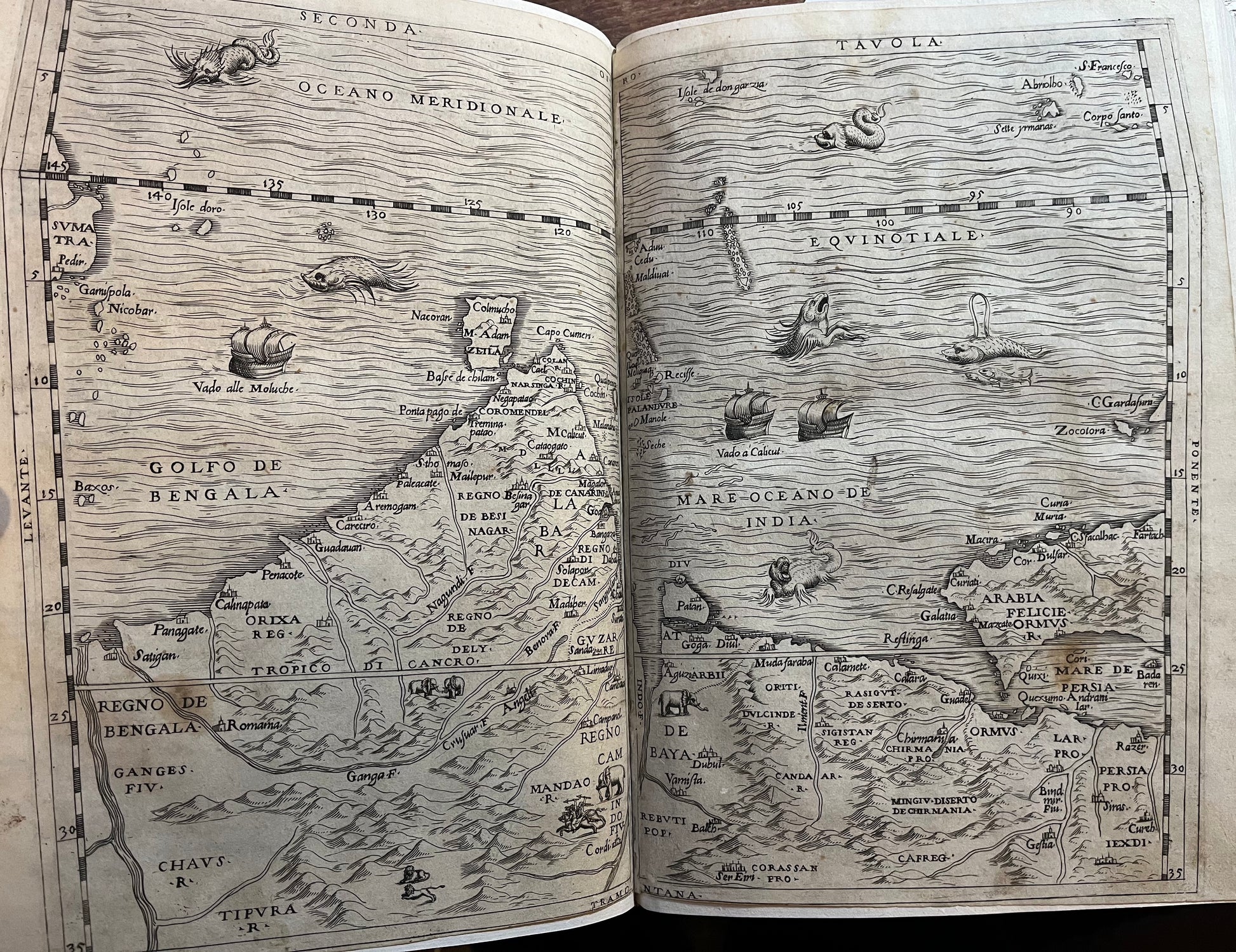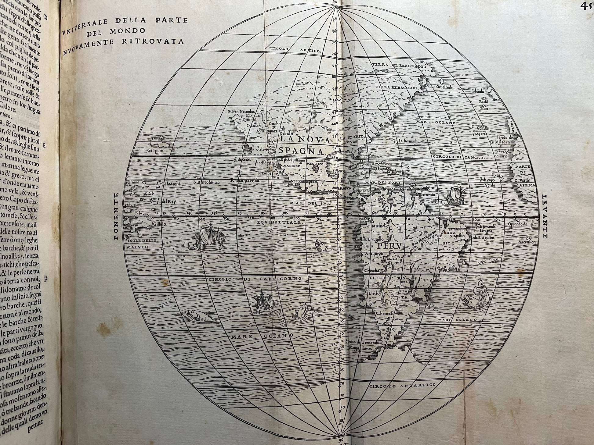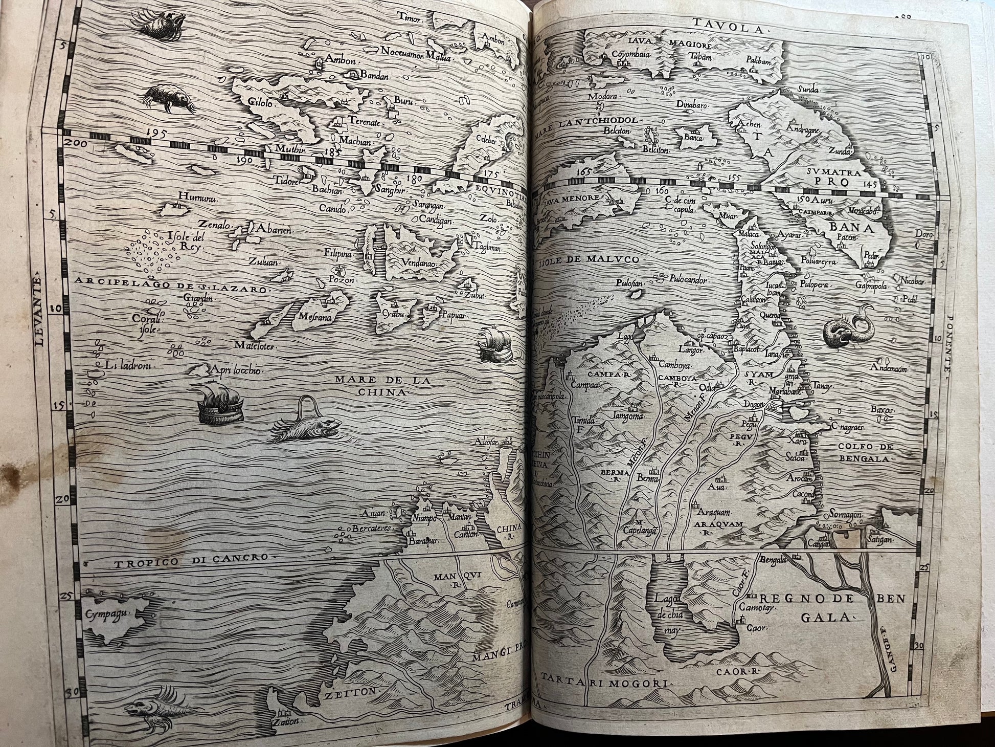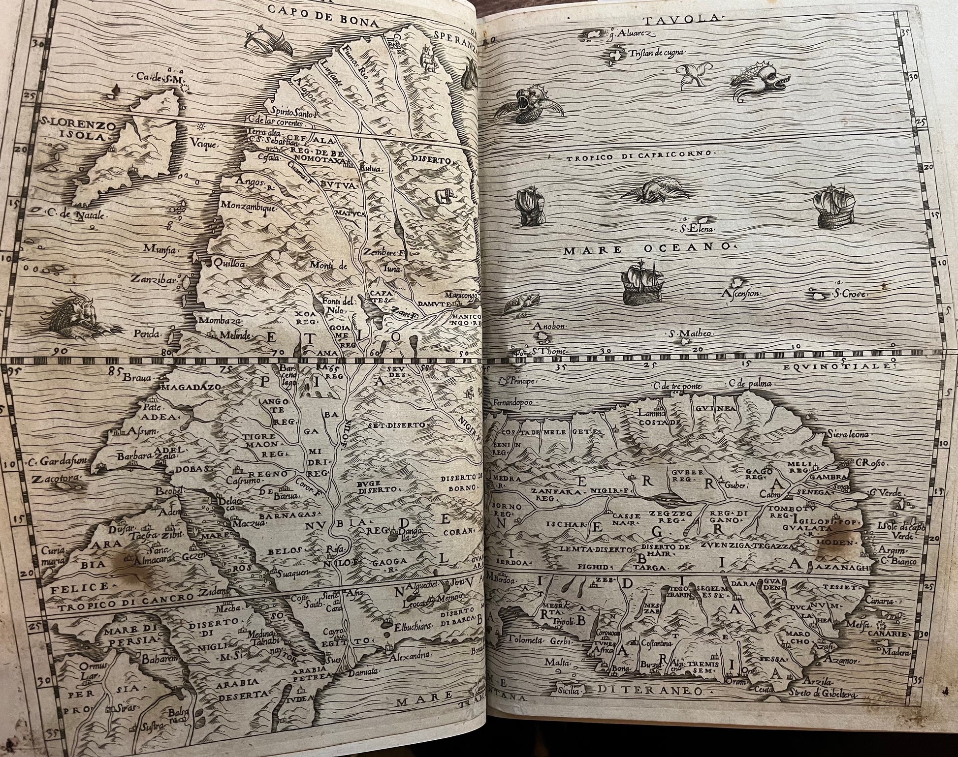 The maps included in the volumes are landmark maps produced by the geographer Gastaldi. The map of South East Asia is particularly important as it is one of the first to depict Japan - with an inaccurate coastline and named “Cympagu”- and the first to name the Philippines "filipina". The maps of the Americas and Africa in the third volume are here in the RARE 1st STATE from 1556. The woodblock of this state was destroyed in a fire in 1557 so all subsequent editions were created using different woodblocks.