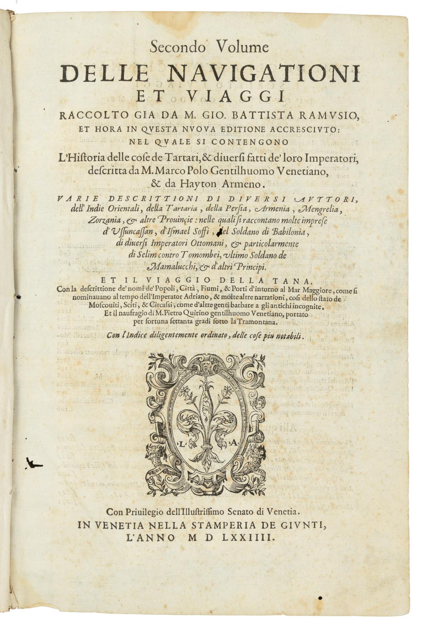 Ramusio's immense compilation is the most important travel collection of the 16th Century. As secretary to the Council of Ten in Venice for 43 years, Ramusio had access to and collected together accounts of global voyages of the period. Nearly all the important early voyages in the age of discovery are present in this work , including those of Columbus, Da Gama, Marco Polo and Magellan.