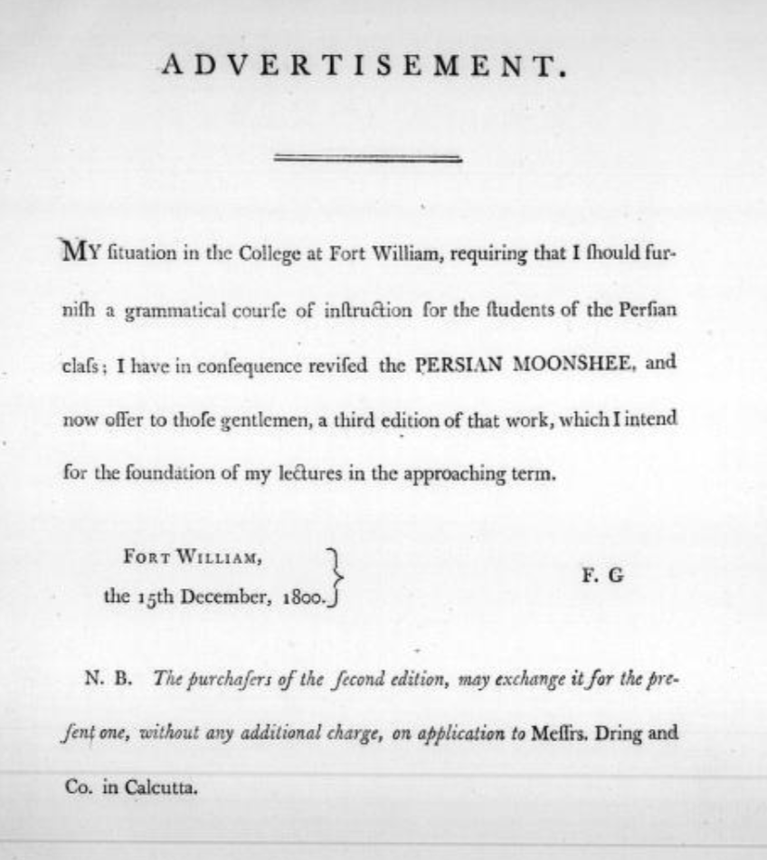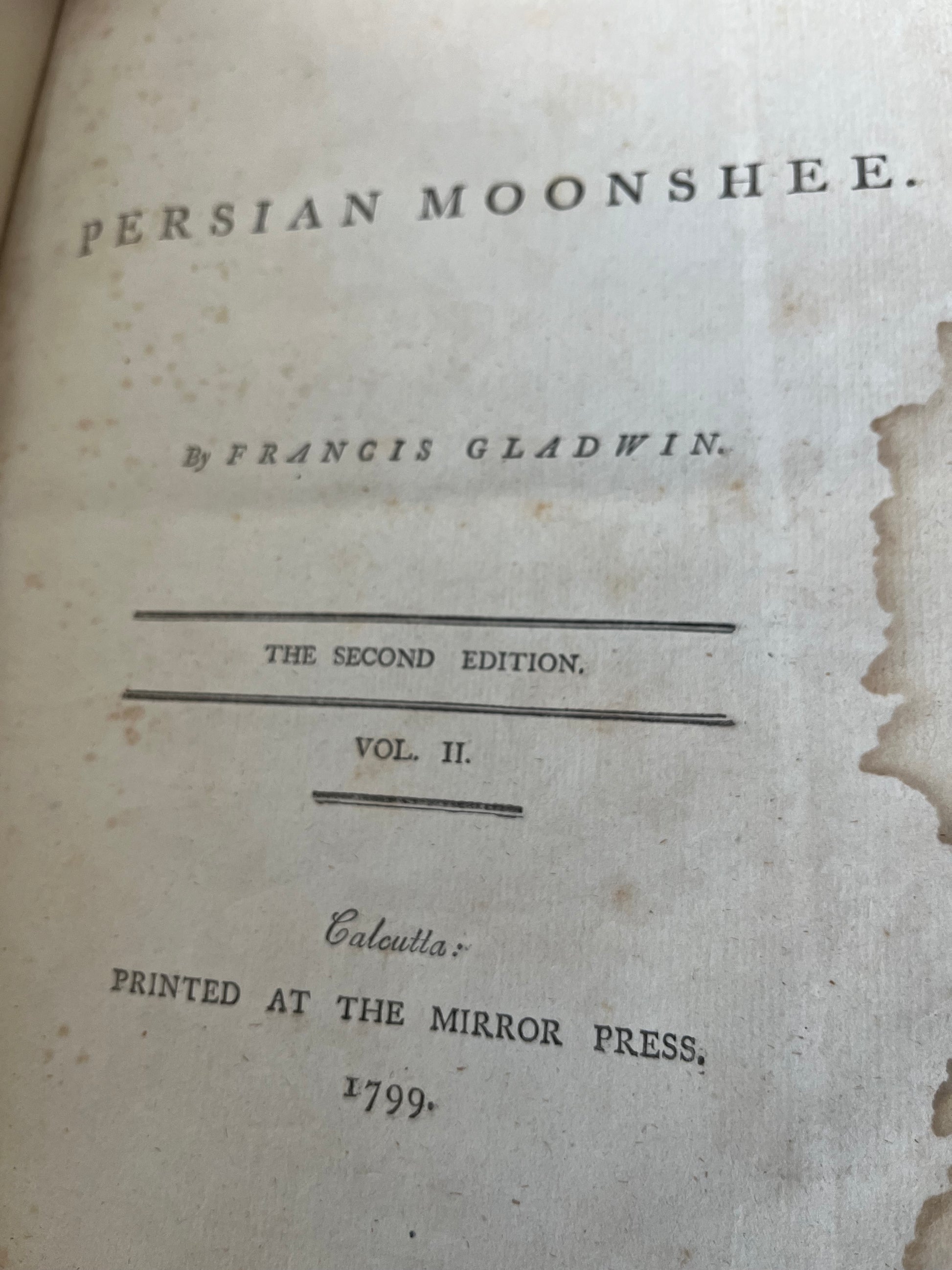 Rare Calcutta imprint - Mirror Press 1799 - The Persian Moonshee