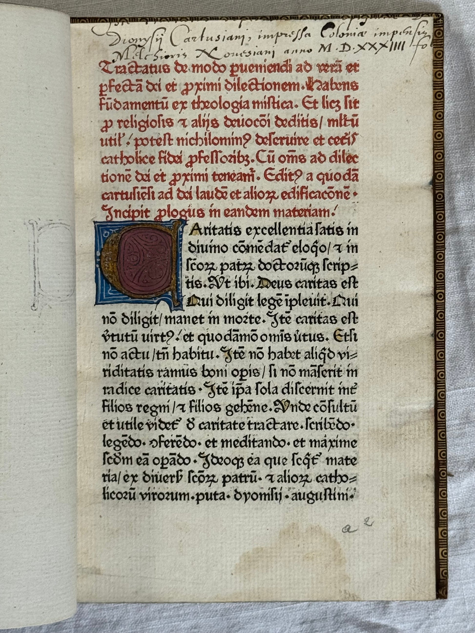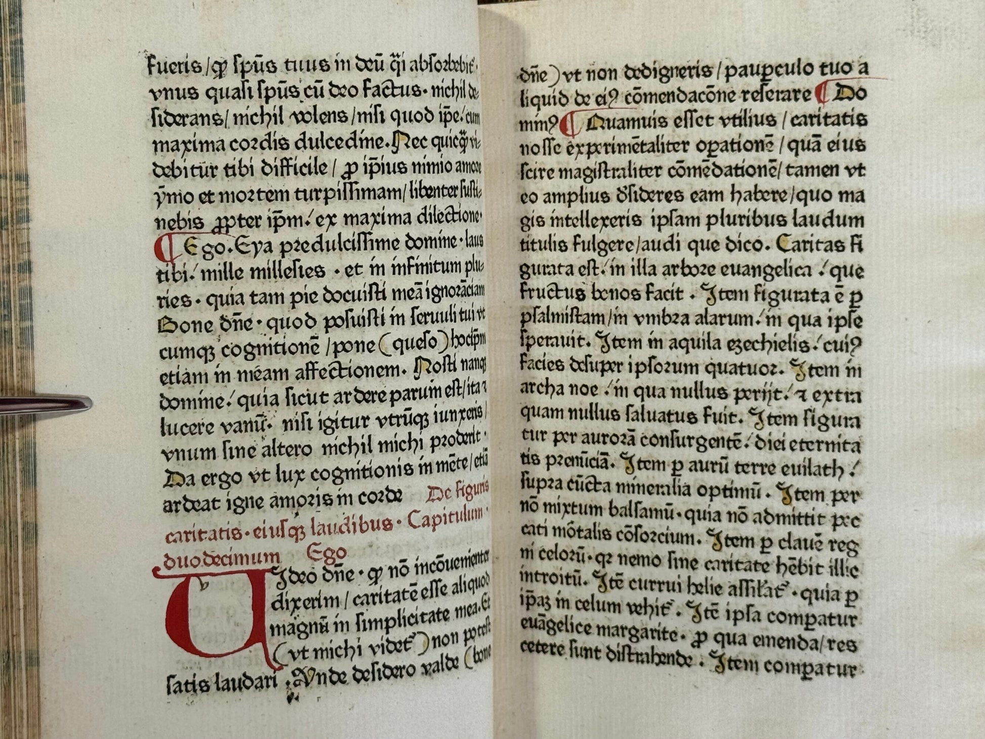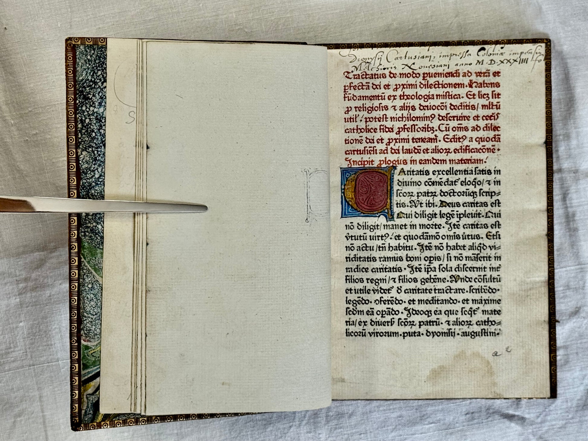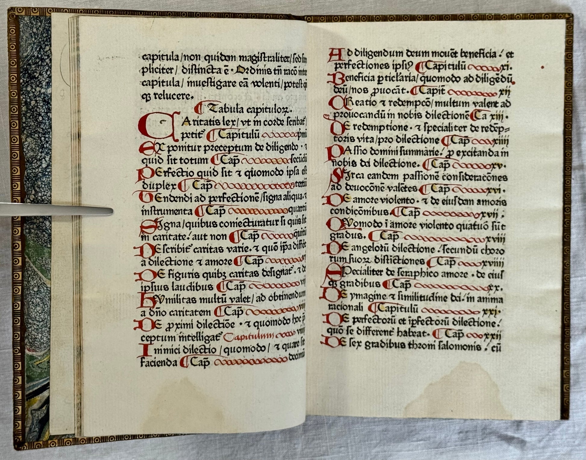 The work "On the way to arrive at true and perfect love of God and neighbour" is the only incunable edition of this work of mediaeval mystical theology. The devotional text describes the ways of arriving at the perfect love of God, and was written by Henricus Arnoldi (c1407- 1489) who was prior of the Carthusian monastery in Basel from 1449-1480. Arnoldi discusses Charity, Love, violence, as well as doubt in God. The Carthusians were a strict order and would have spent many hours reflecting and praying to God and contemplating the meaning of Life, Love and Death. The Text concludes with a prayer to the Virgin Mary, that she may grant grace and charity on the reader.