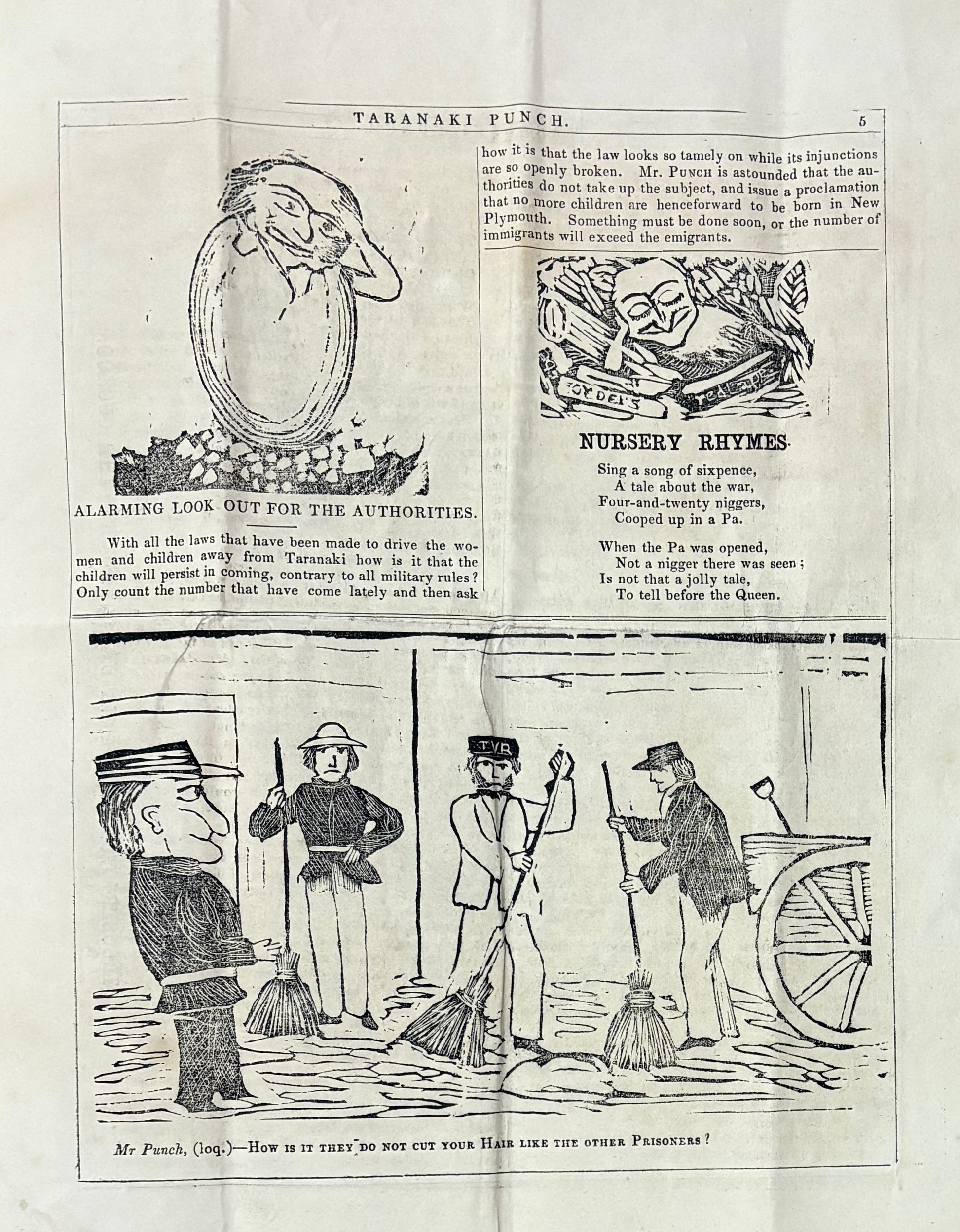 "Nursery Rhymes" - "Sing a song of sixpence, A tale about the war, Four-and-twenty n***ers Cooped up in a Pa (Maori fort). When the Pa was opened, Not a N***er there was seen; Is not that a jolly tale, to tell before the Queen