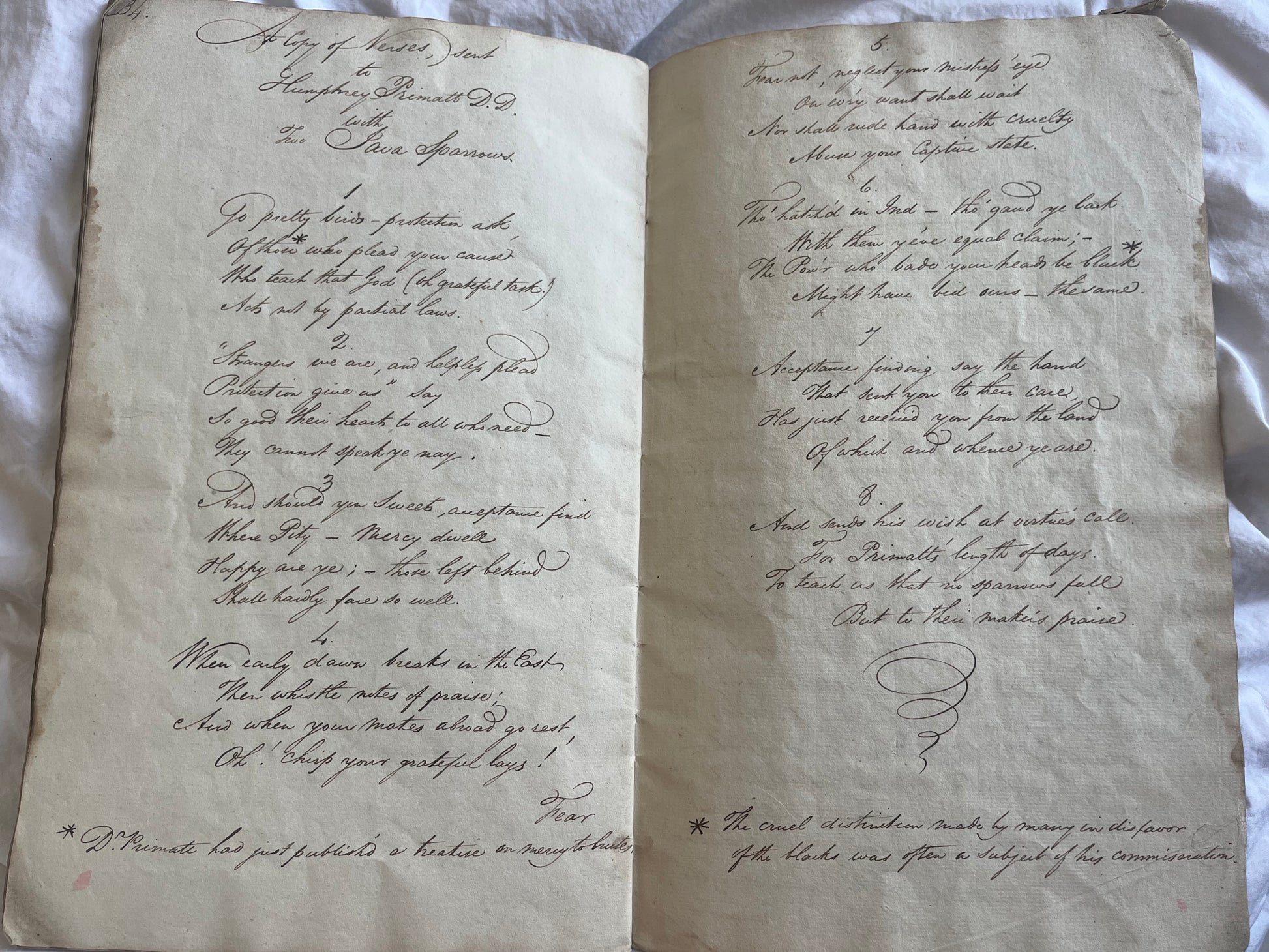 ‘A Copy of Verses sent to Humphrey Primatt. D.D. with two Java Sparrows.' pp. 34-35 7 verse poem