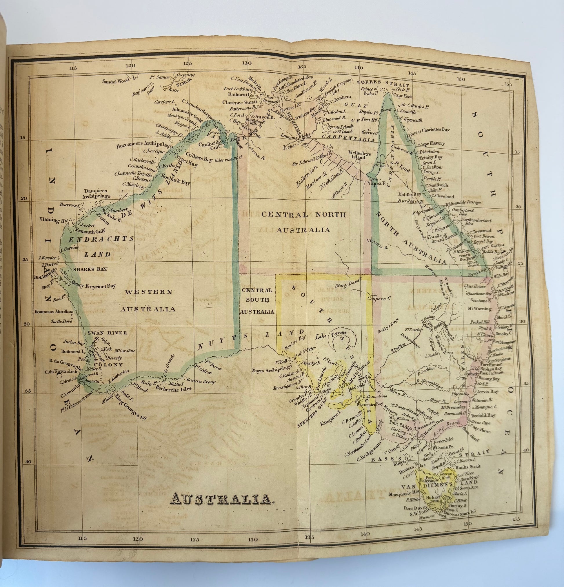 This is interesting contemporary description of Australia, Illustrated by a folding hand coloured map of Australia, 22 full-page lithographic hand coloured county maps and 4 full-page engraved views of Sydney.